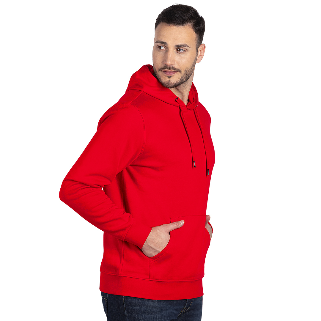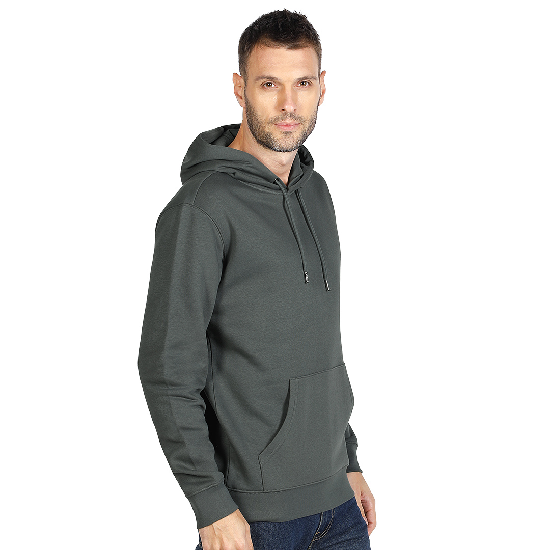 Dukserica od organskog pamuka, prednji džep, učkur u kapuljači u boji dukserice, elastične ranfle na rukavima i dnu, dodatni štepovi na ramenima, rukavima i dnu, okovratnik ojačan trakom