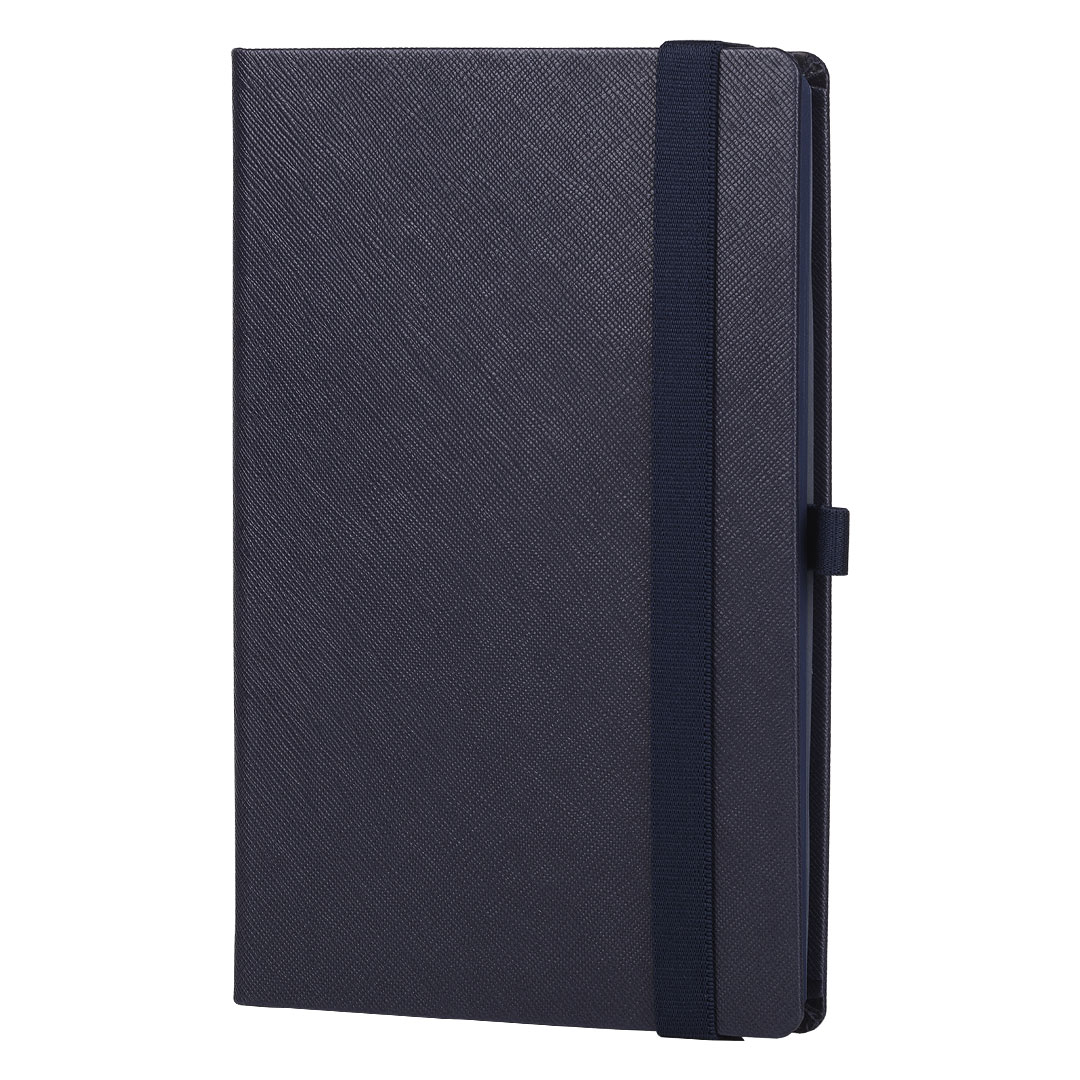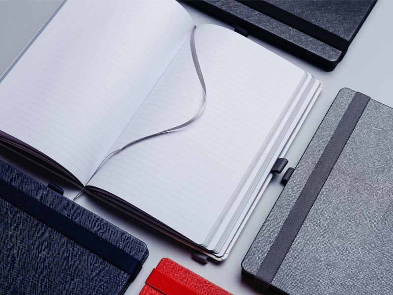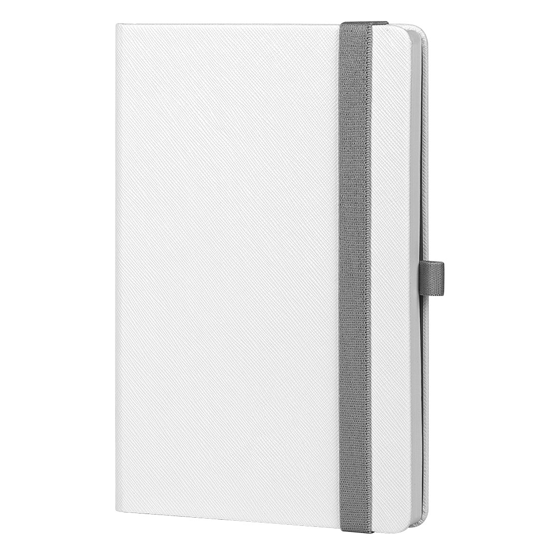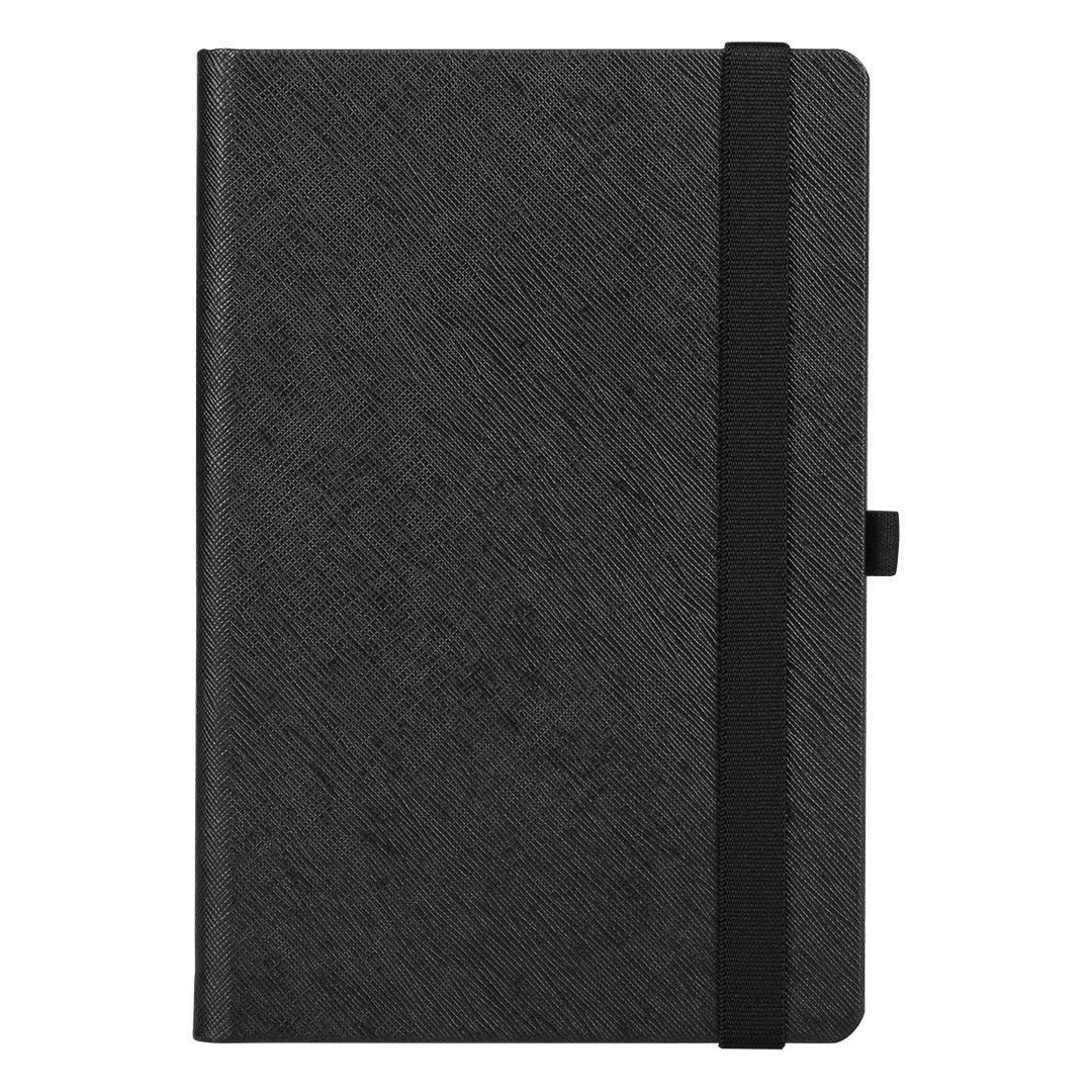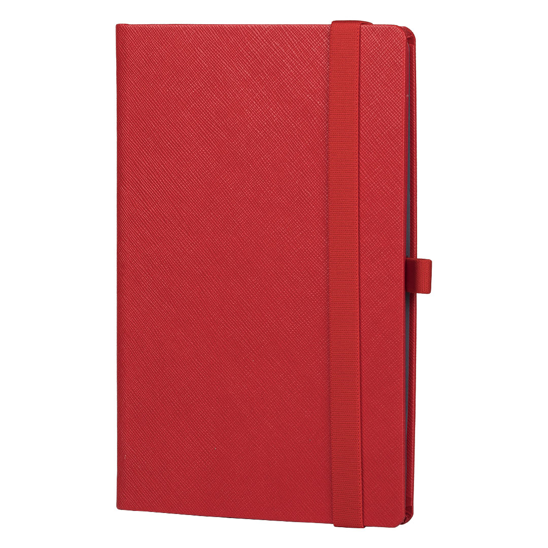 Notes sa zaobljenim ivicama, bojenom ivicom knjižnog bloka u boji korice, elastičnom trakom, držačem za olovku i džepom na unutrašnjoj strani zadnje korice
