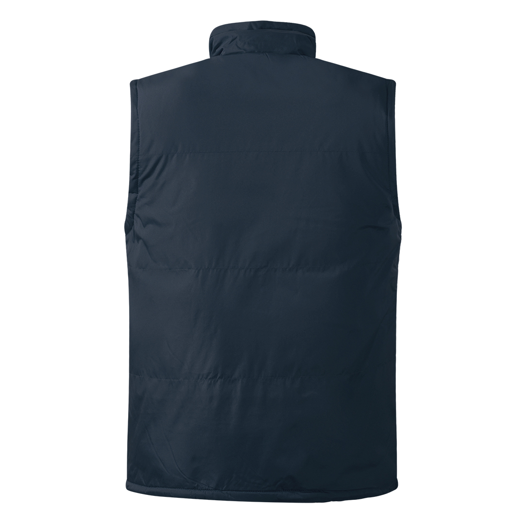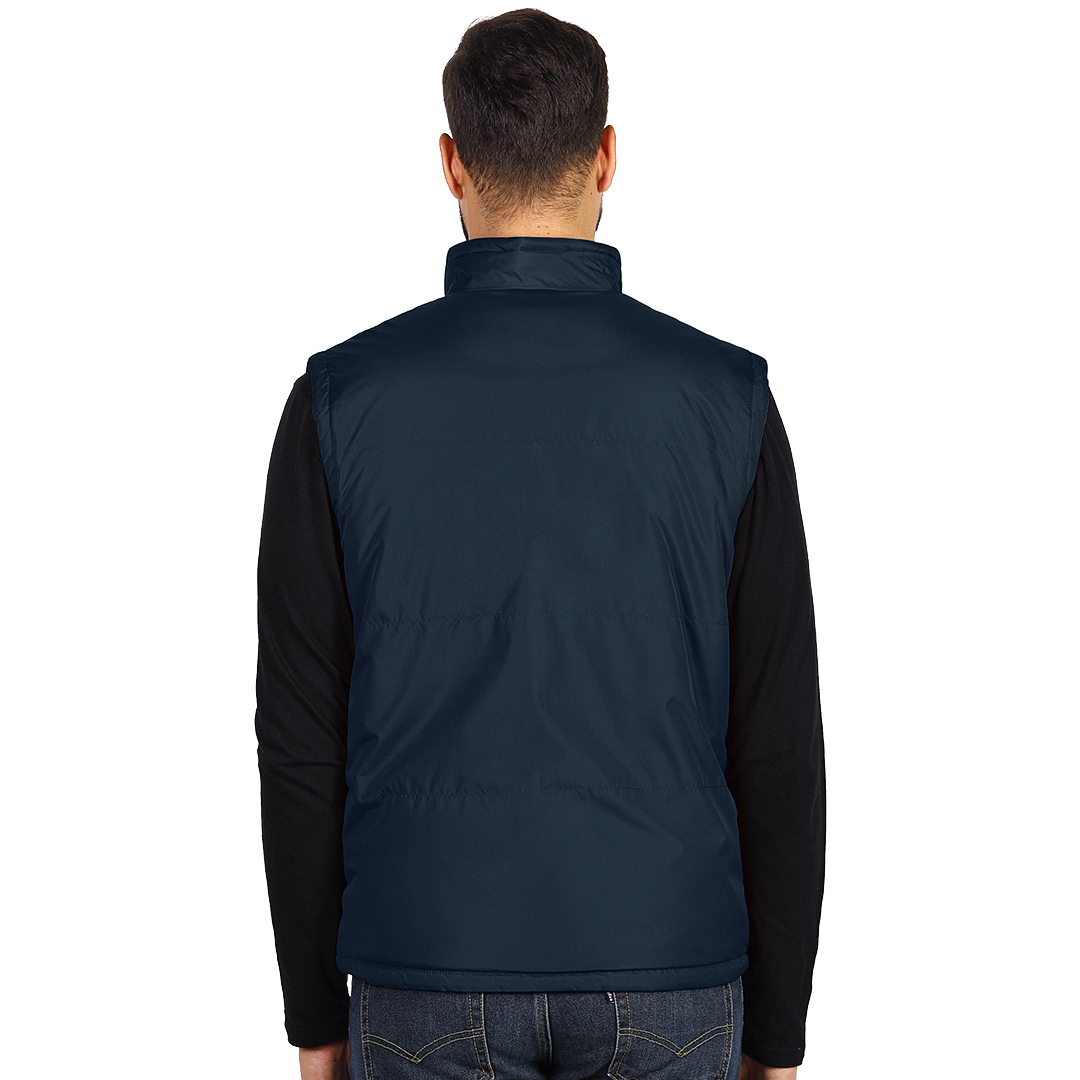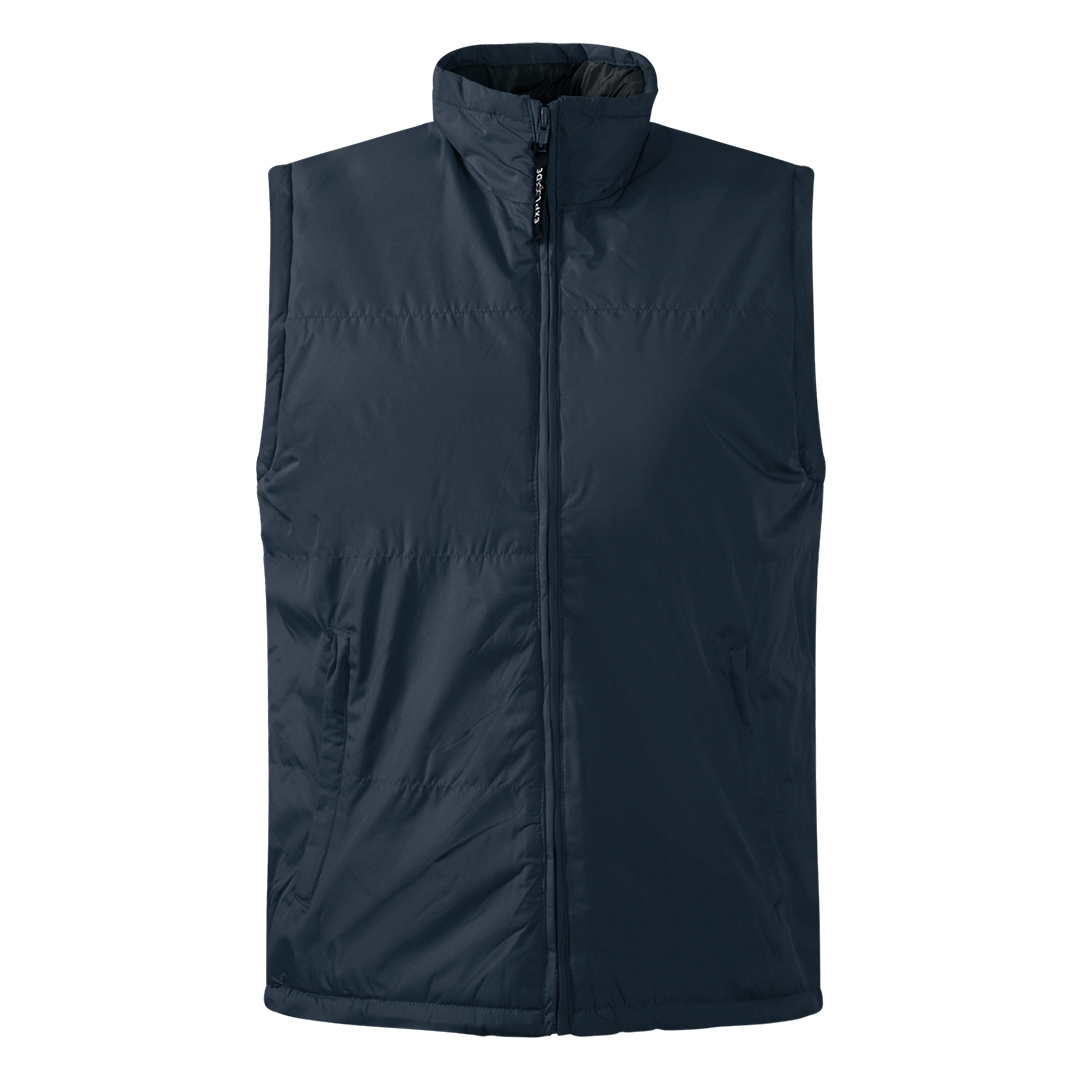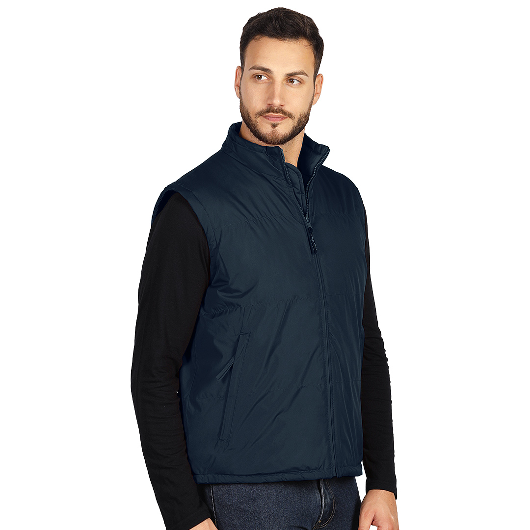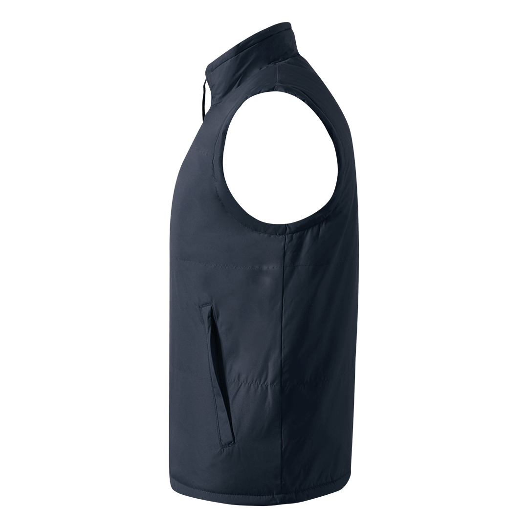 Prsluk, štepan, visoka kragna, dva prednja džepa sa rajsferšlusom i dva unutrašnja džepa, postavljen tamno sivim poliesterom, elastični učkuri sa steznim regulatorima u dnu, skriveni unutrašnji rajsferšlus na leđima za lakši pristup prilikom štampanja