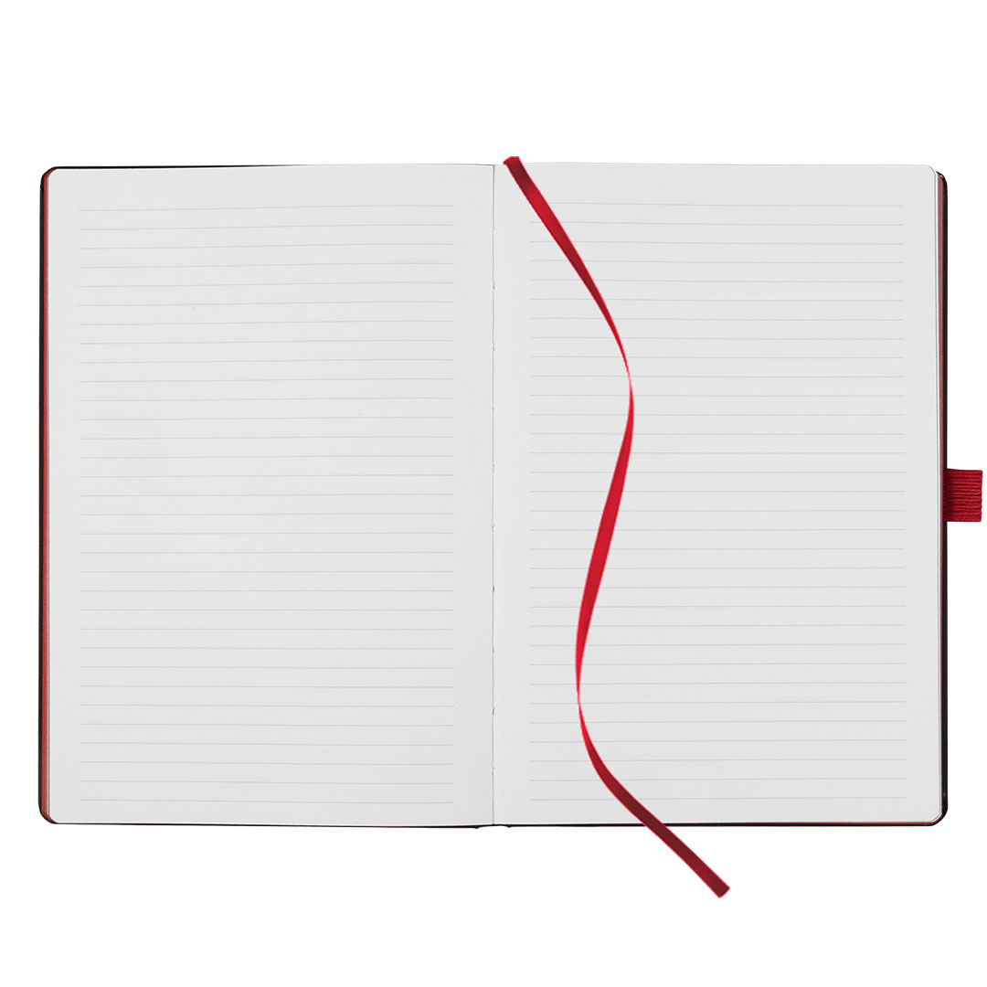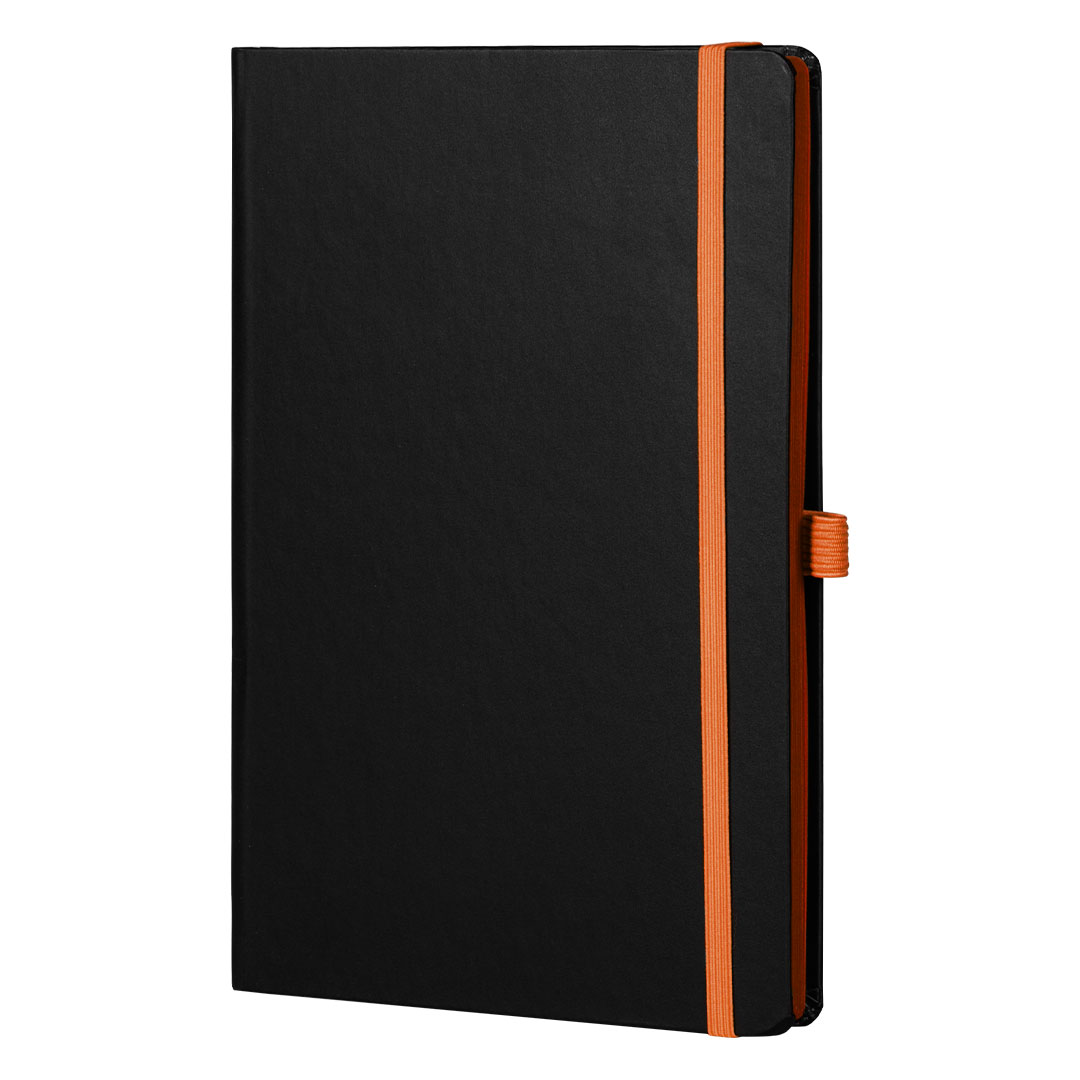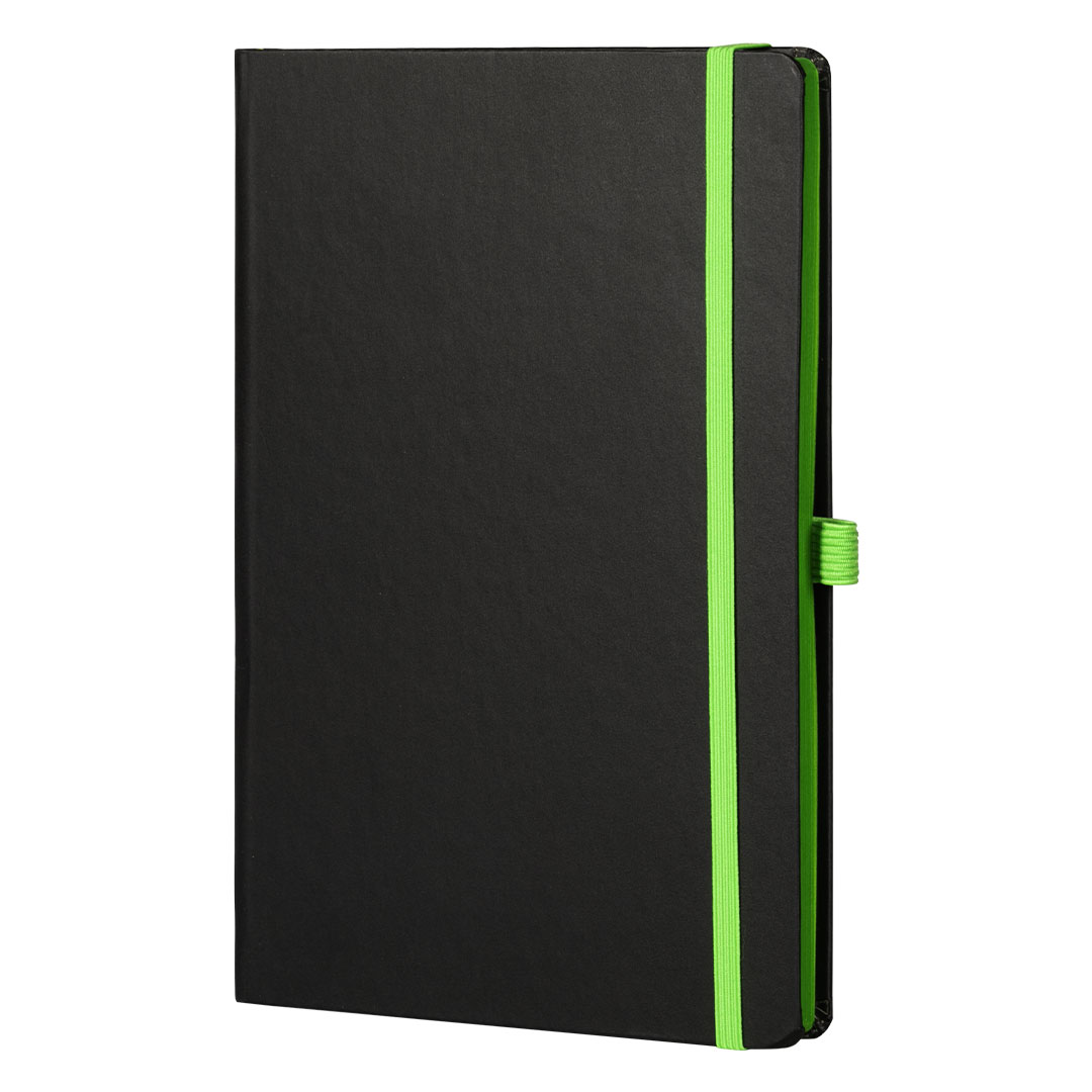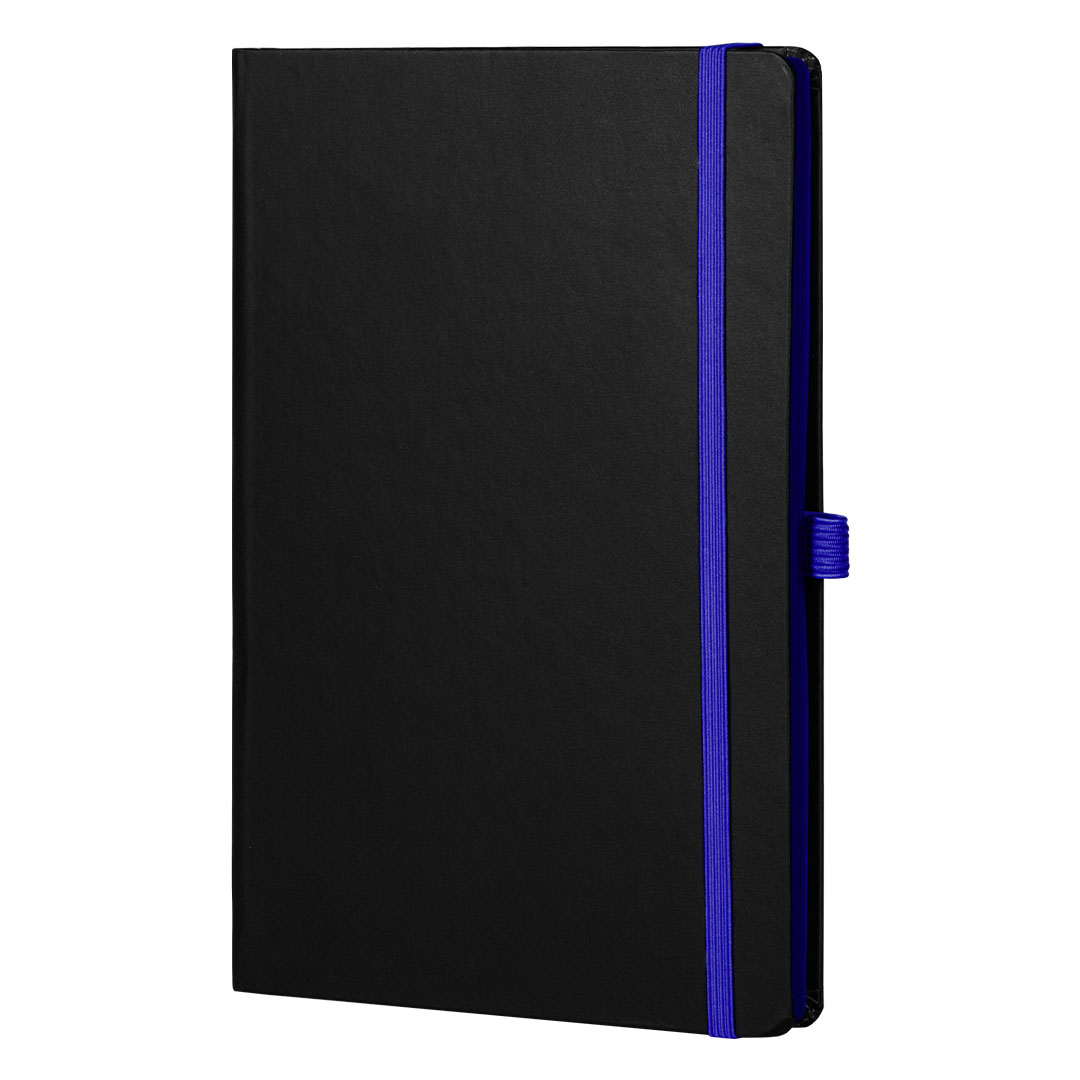 Notes sa zaobljenim ivicama, bojenom ivicom knjižnog bloka u boji elastične trake, bojenim predlistom u boji elastične trake, elastičnom trakom i držačem za olovku