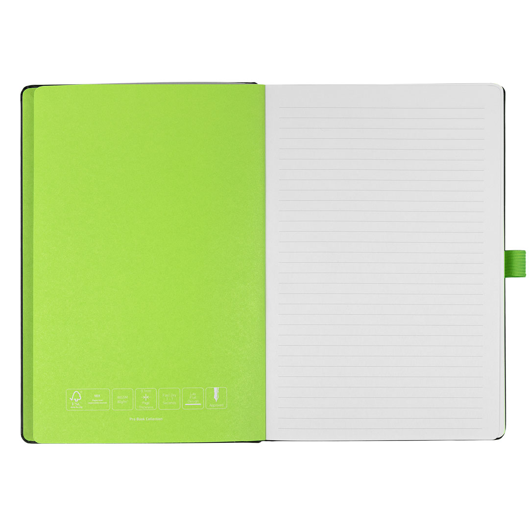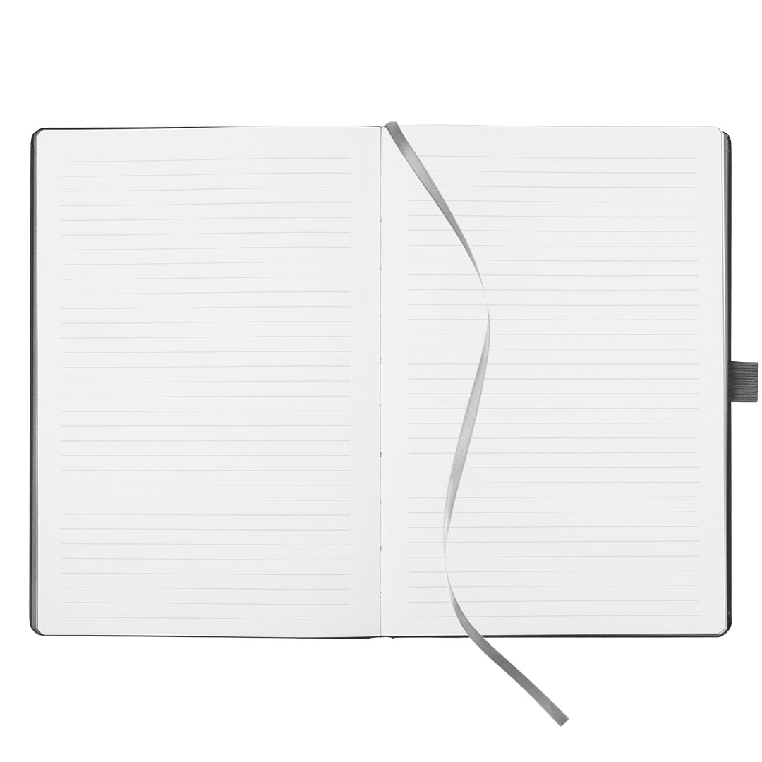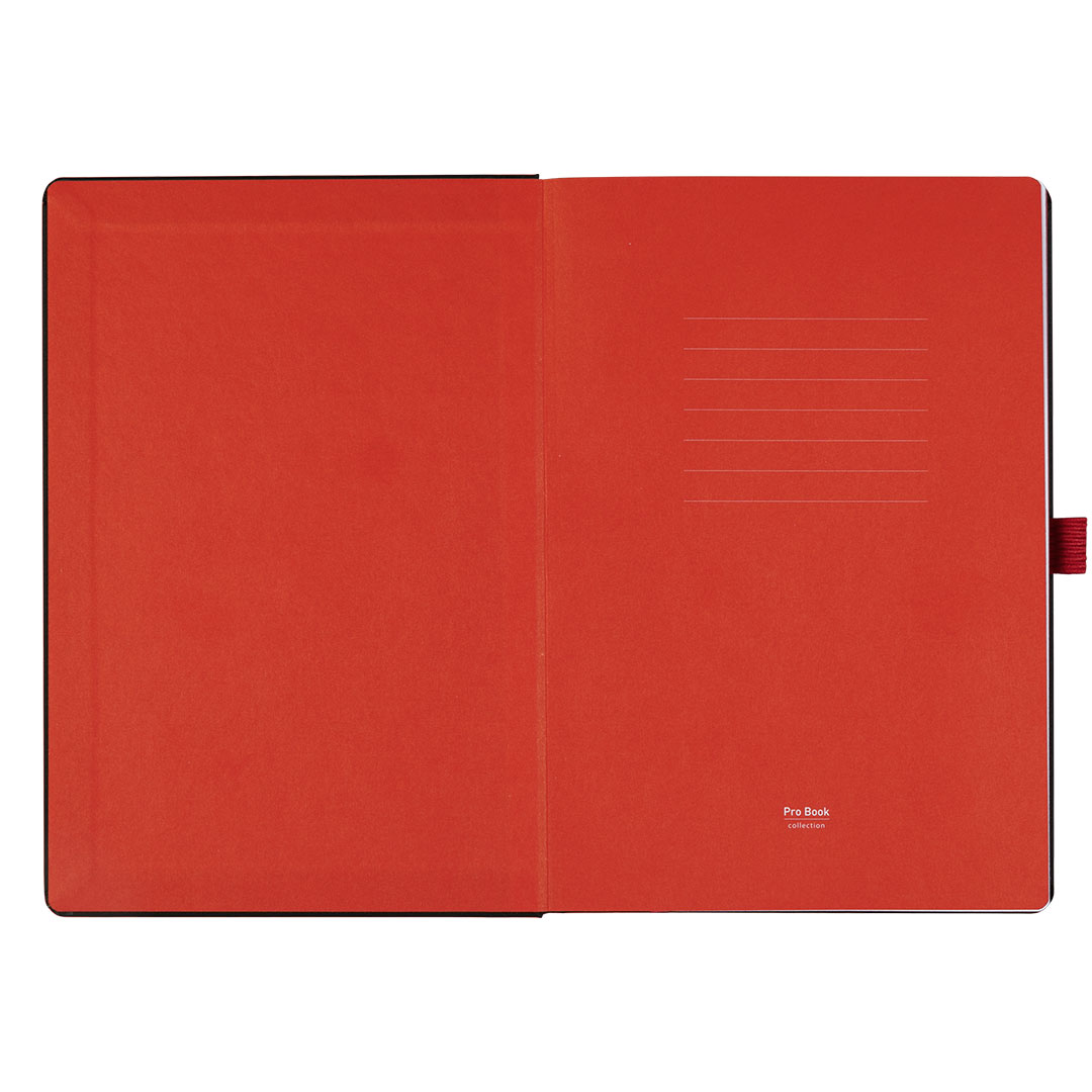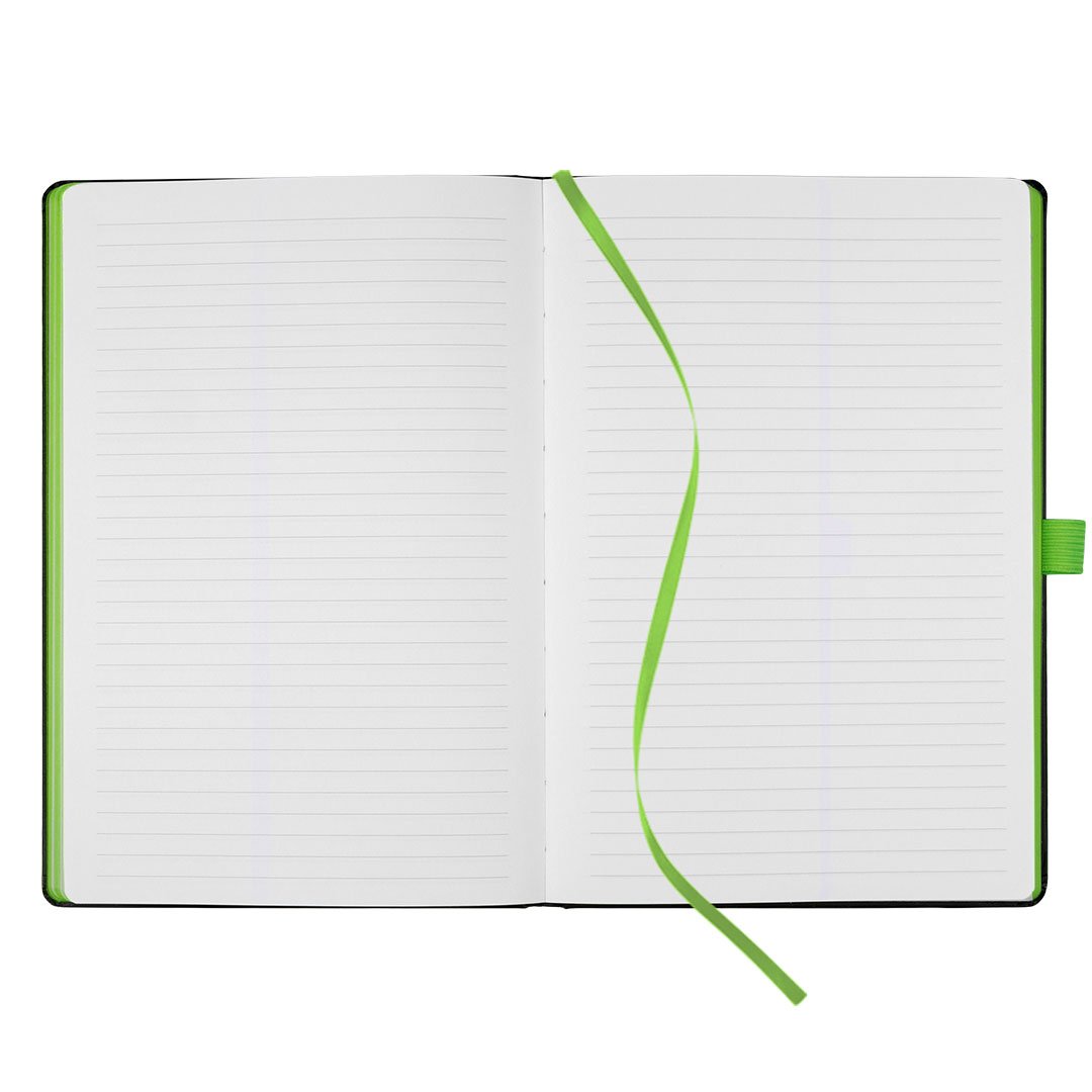 Notes sa zaobljenim ivicama, bojenom ivicom knjižnog bloka u boji elastične trake, bojenim predlistom u boji elastične trake, elastičnom trakom i držačem za olovku
