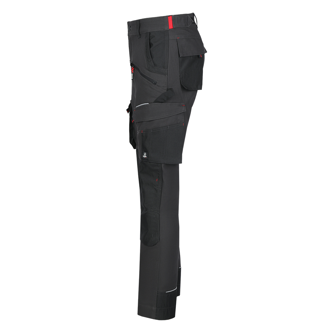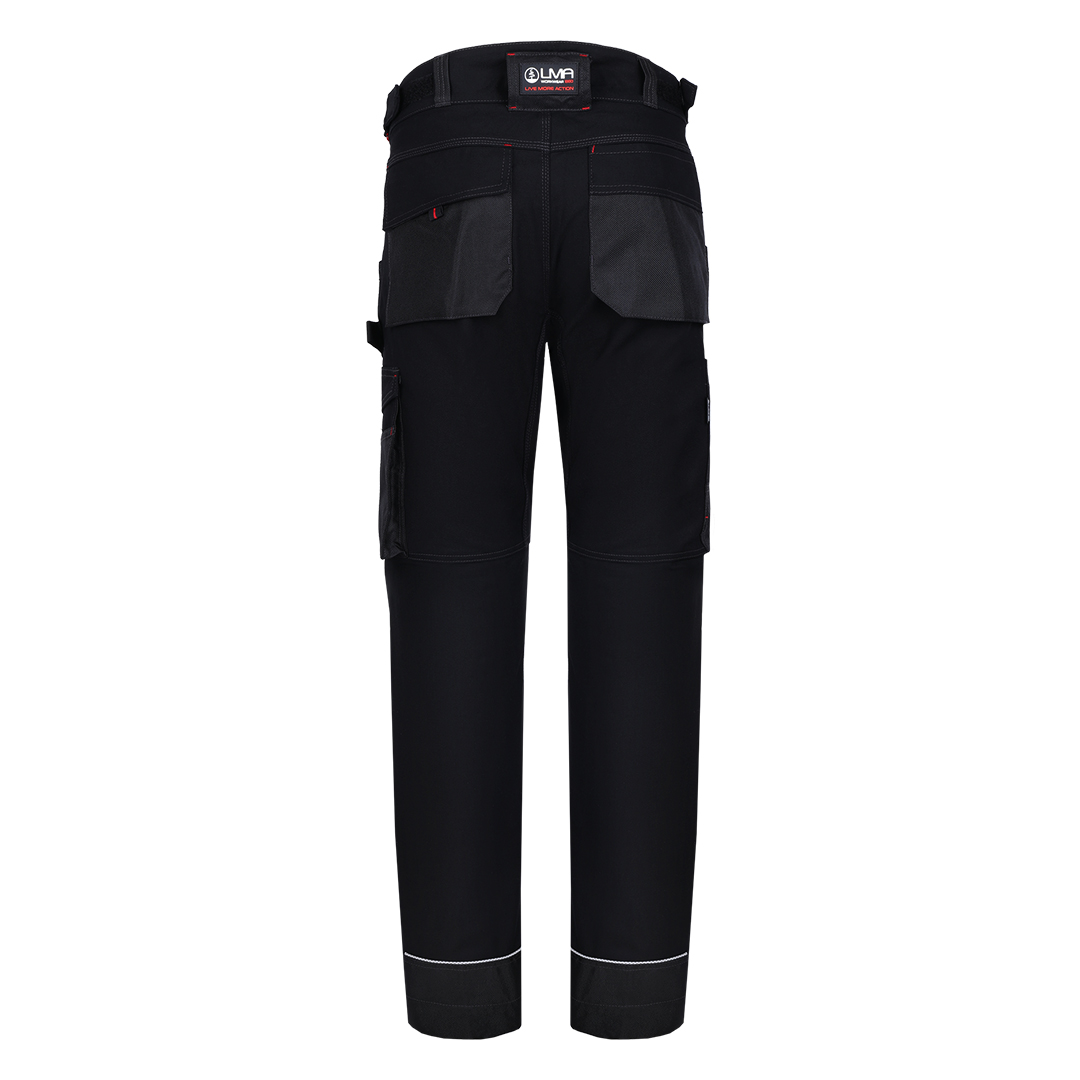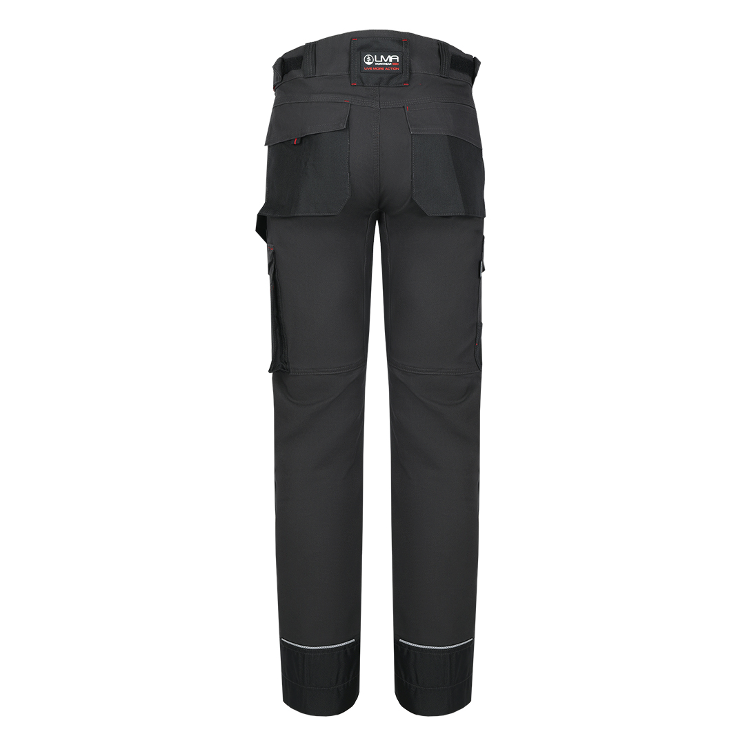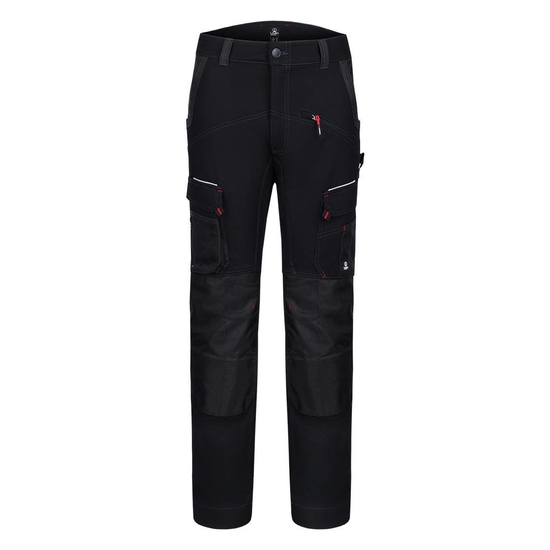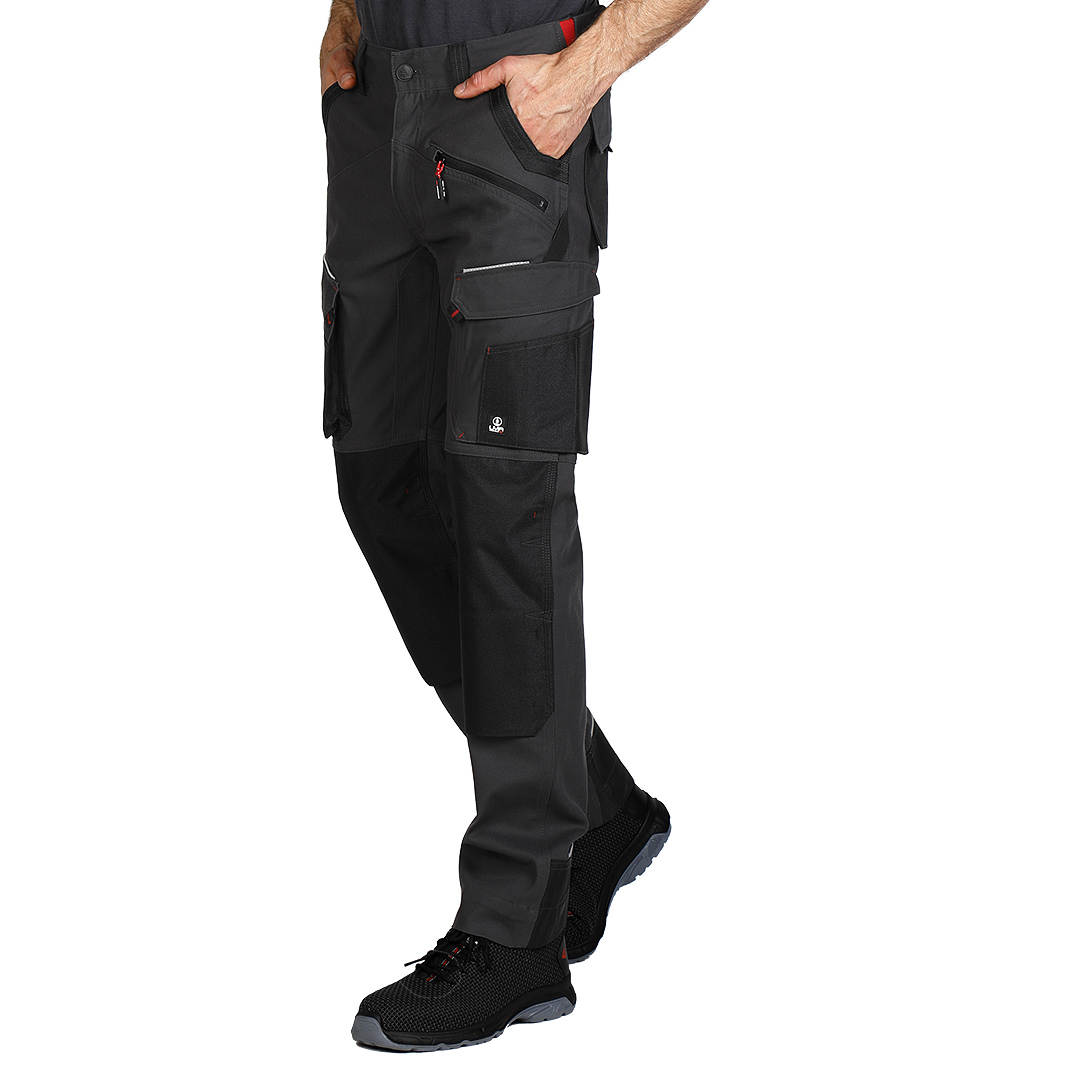 Pantalone, 300g/m2 platno prepletaj, ojačanja od 900D poliestera na mestima izloženim većem habanju (džepovi, kolena), džepovi za umetanje štitnika za kolena, tri prednja džepa (jedan sa rajsferšlusom), dva pozadi i dva džepa sa strane, reflektivni detalji, praktični odeljci za alat, gajka za čekić, pojas sa čičak trakom za podešavanje širine u struku za dodatnu udobnost, trostruki štepovi kao ojačanje