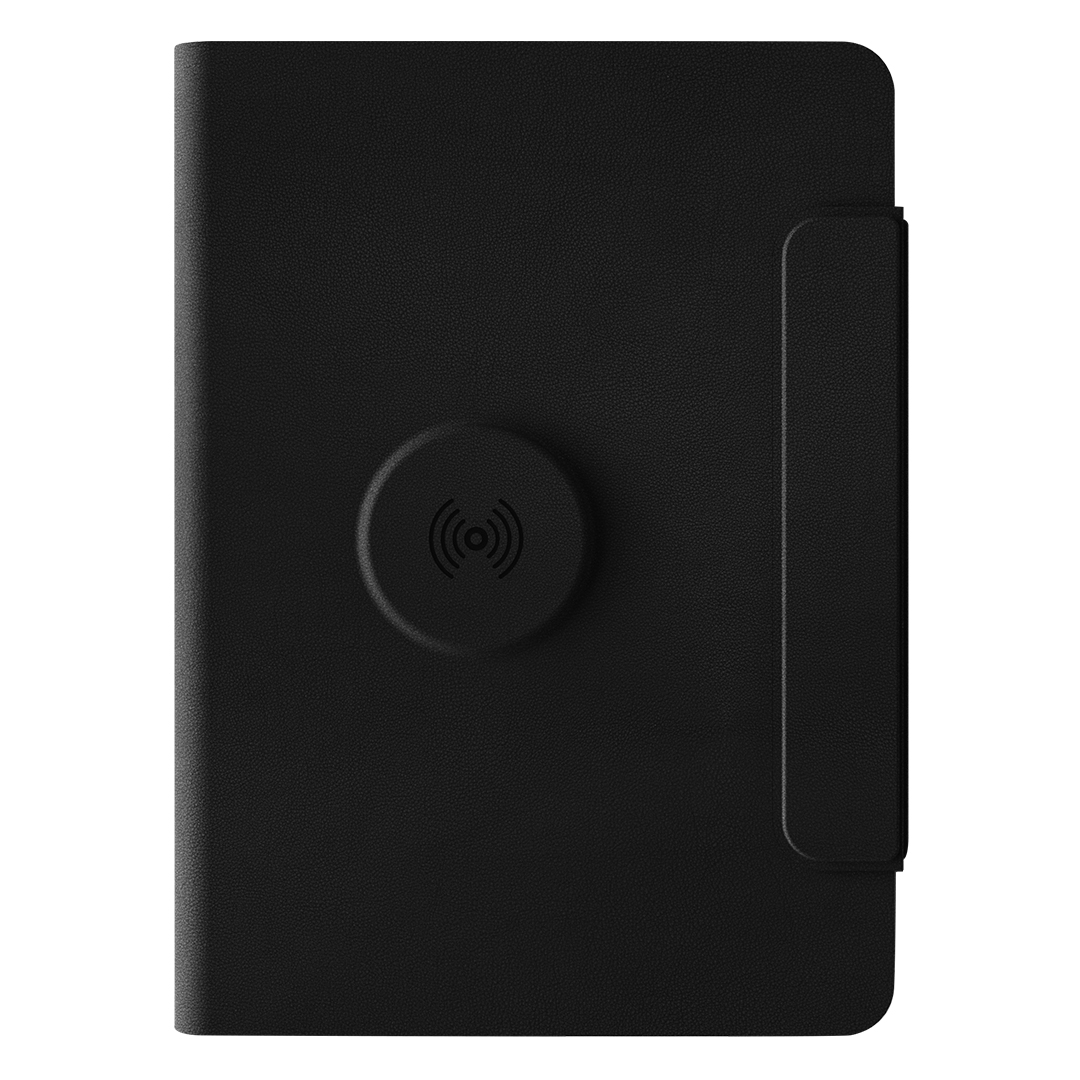 Poslovni portfolio sa notesom • Format notesa: A5 • 128 strana • Krem papir • Materijal: reciklirana eko-koža • Ugrađena pomoćna baterija: 5.000 mAh • Bežični punjač sa magnetom za telefon i slušalice • Type-C port • Type-C kabl • Magnetni zatvarač • Poklon pakovanje • Idealan za poslovne i promotivne namene