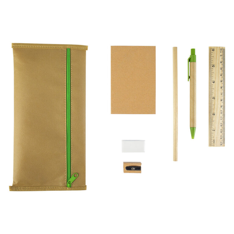 Set za pisanje i crtanje, 7/1 Set sadrži: pernicu, notes, drveni lenjir, drvenu olovku, hemijsku olovku, gumicu, zarezač
