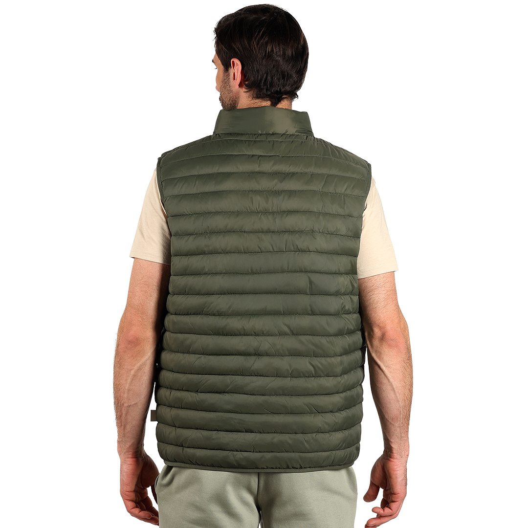 Štepani prsluk sa laganim punjenjem, dva prednja džepa, elastični paspuli oko ramena i džepova, vrećica za pakovanje