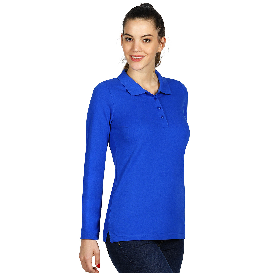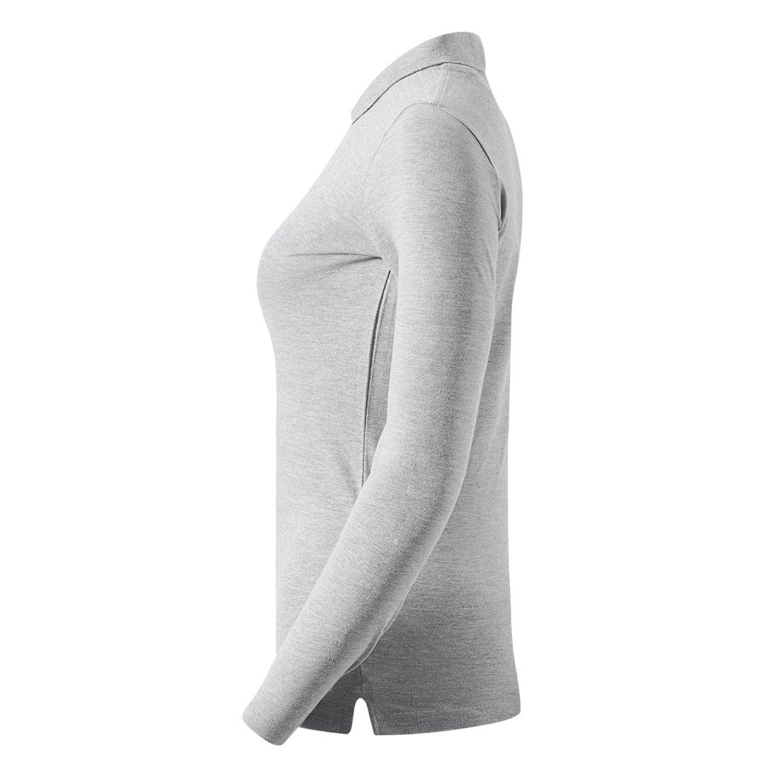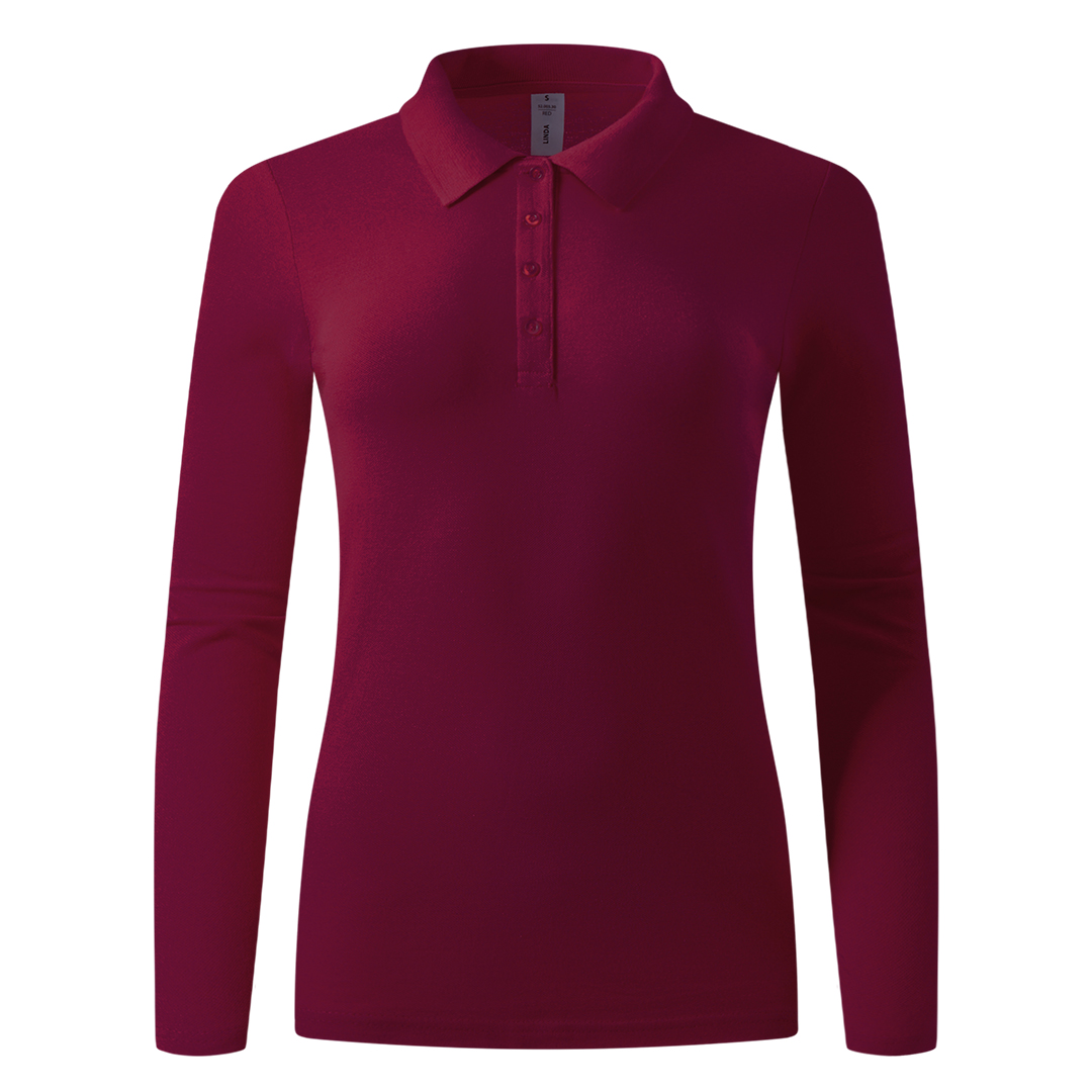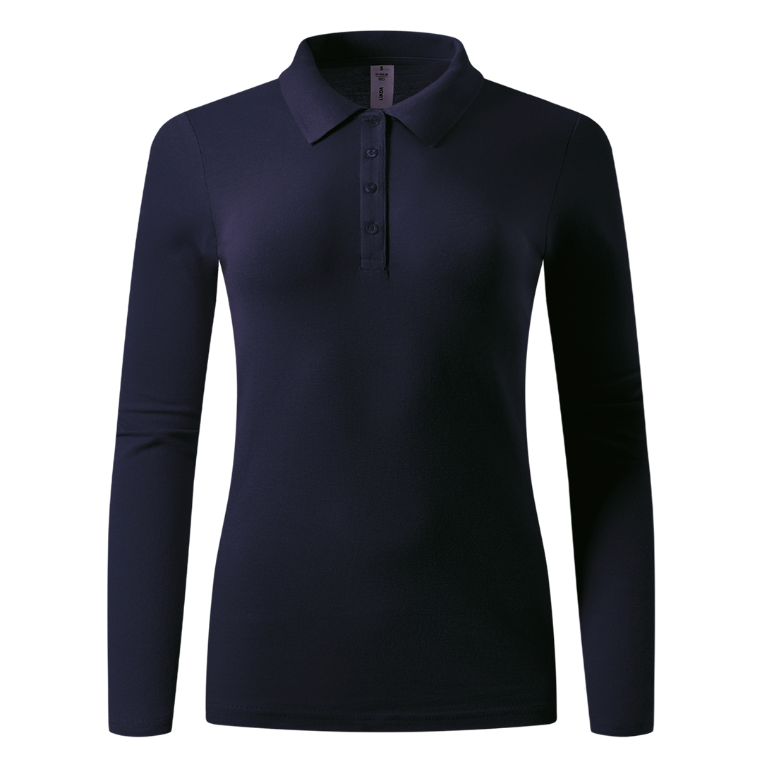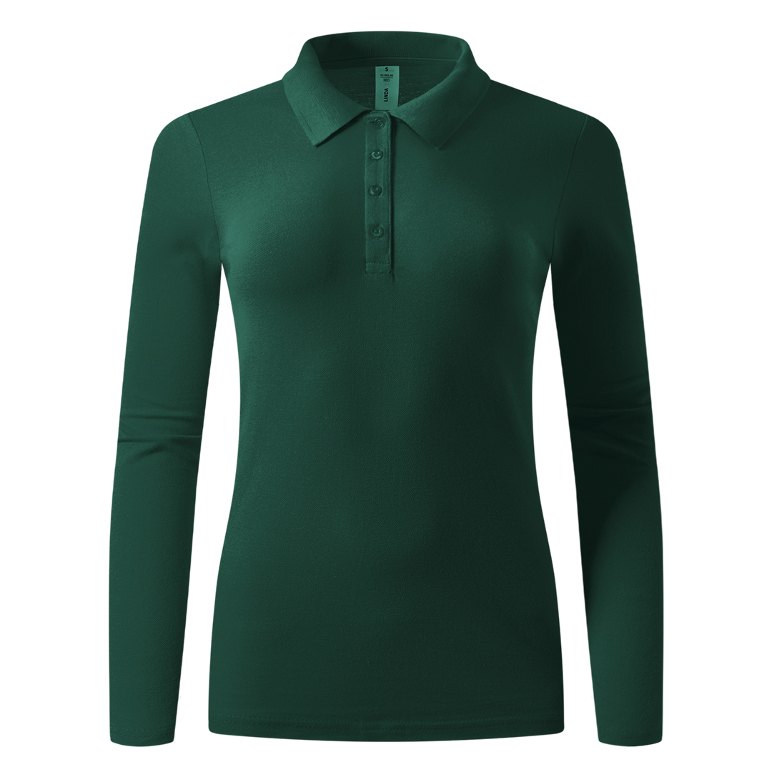 Ženska polo majica dugih rukava, 200 g/m2, blago strukirana, šivena sa strane, dupli štepovi na rukavima i dnu, četiri dugmeta u boji majice, rezervno dugme, dodatni štep duž ramena, okovratnik ojačan trakom, šlicevi sa strane