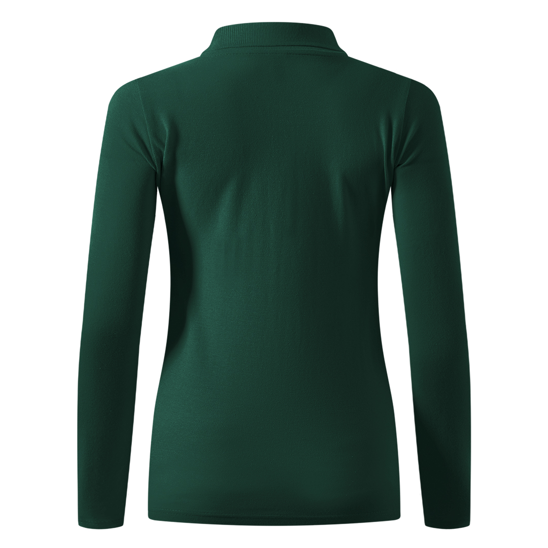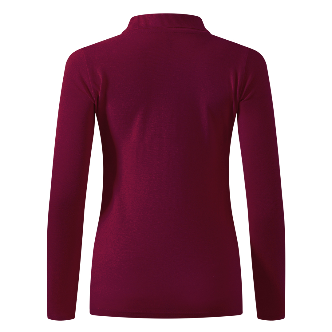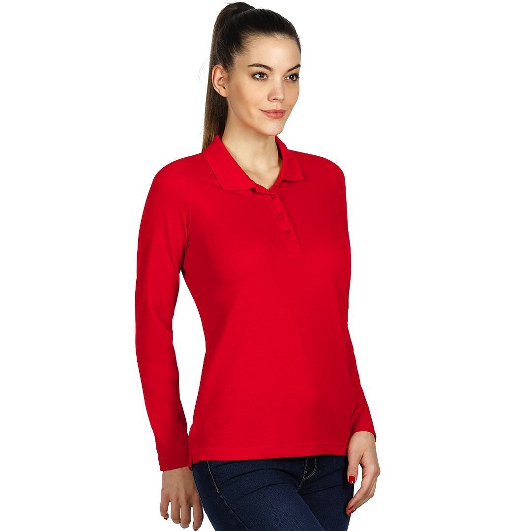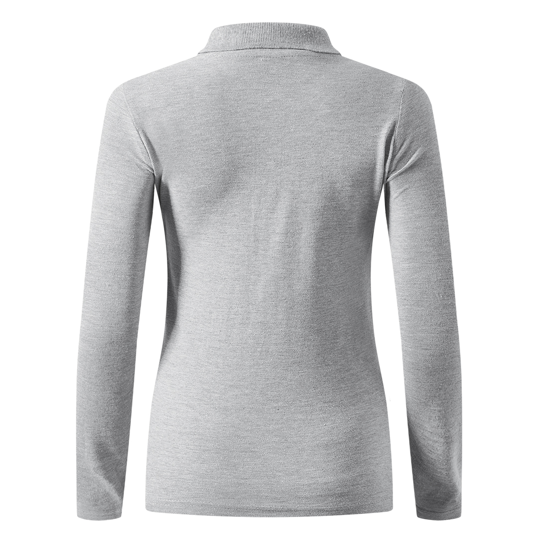 Ženska polo majica dugih rukava, 200 g/m2, blago strukirana, šivena sa strane, dupli štepovi na rukavima i dnu, četiri dugmeta u boji majice, rezervno dugme, dodatni štep duž ramena, okovratnik ojačan trakom, šlicevi sa strane