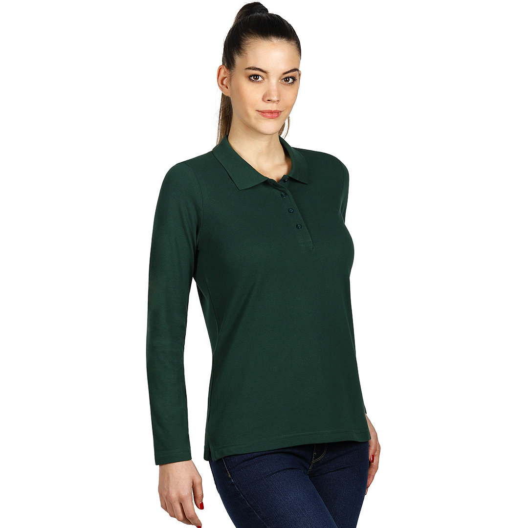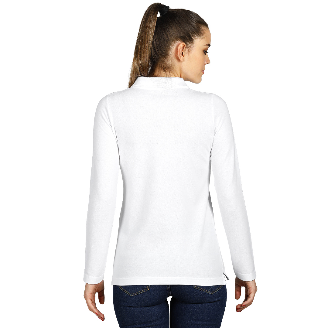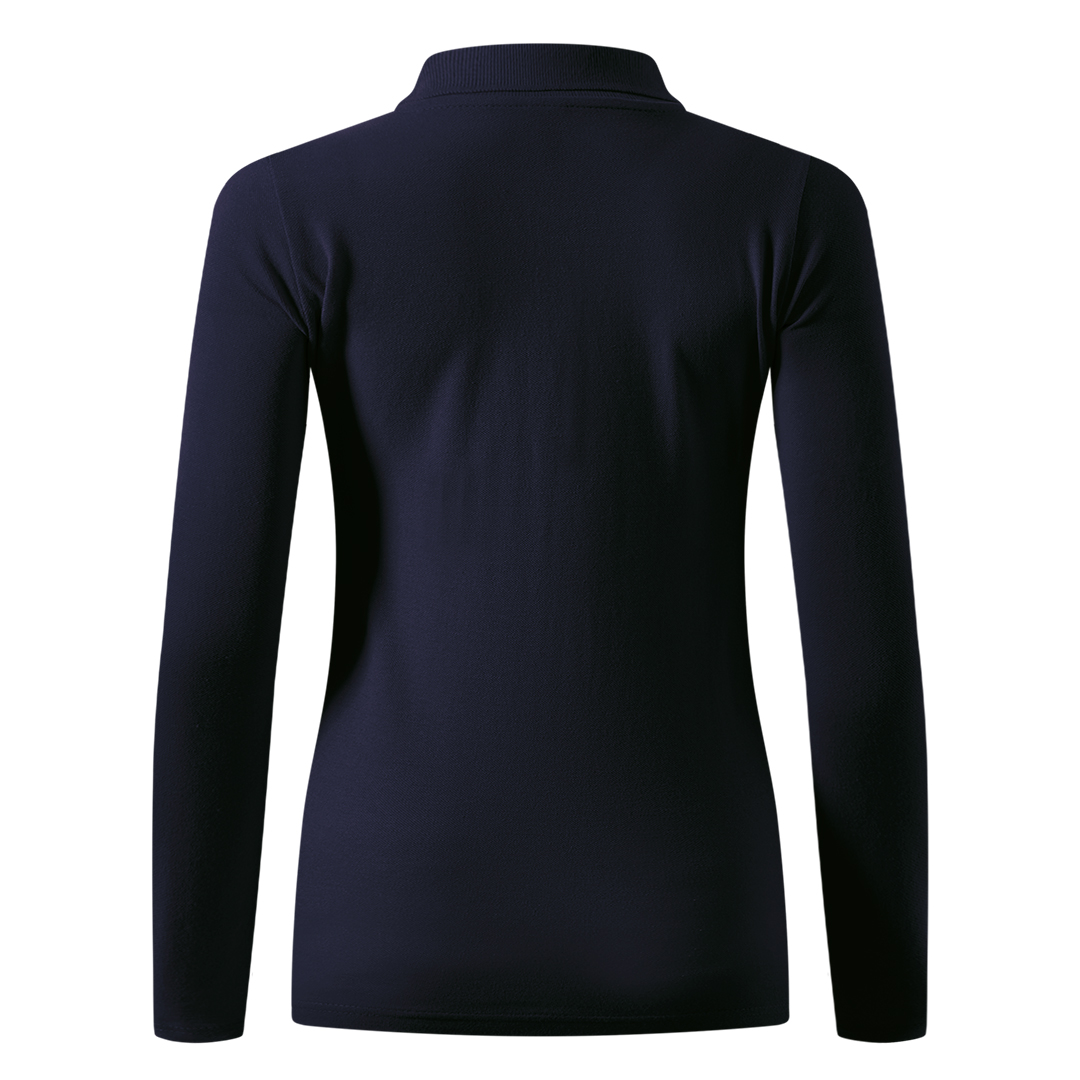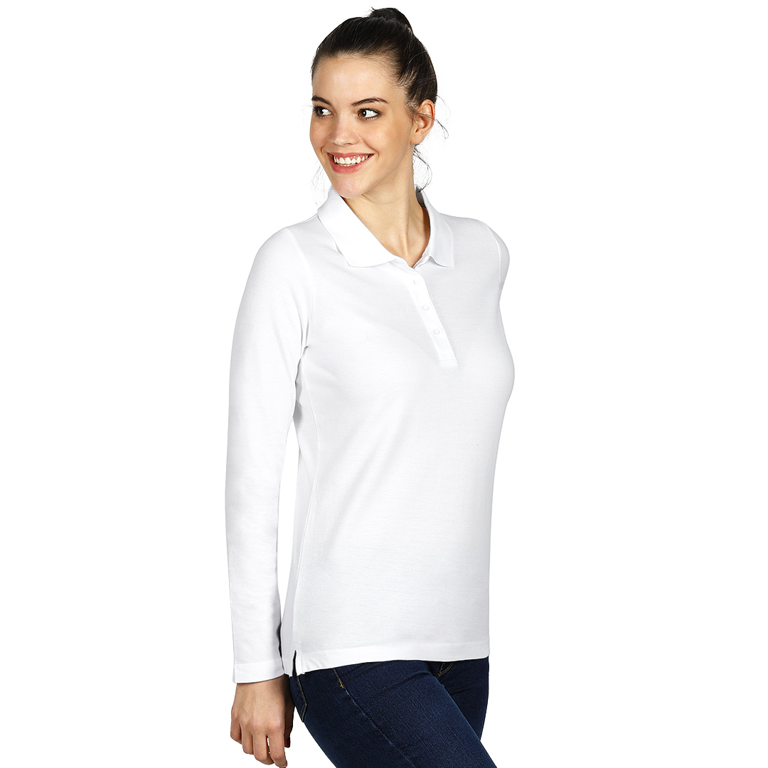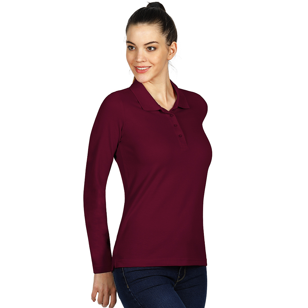 Ženska polo majica dugih rukava, 200 g/m2, blago strukirana, šivena sa strane, dupli štepovi na rukavima i dnu, četiri dugmeta u boji majice, rezervno dugme, dodatni štep duž ramena, okovratnik ojačan trakom, šlicevi sa strane