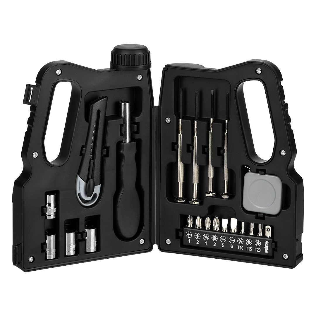 Set alata sadrži skalpel, 4 fiksna odvijača – 2 ravna i 2 krstasta, metar, držač sa 4 izmenjiva nastavka i 10 uložaka