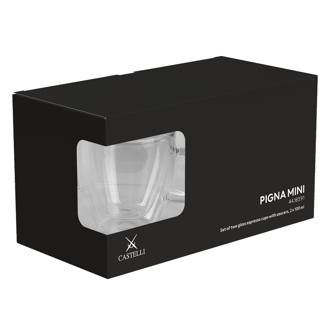 PIGNA MINI je set od dve šoljice sa dve tacne izrađen od borosilikatnog stakla, materijala poznatog po visokoj otpornosti na toplotne šokove, izdržljivosti i laganoj strukturi – idealnoj za svakodnevnu upotrebu sa toplim napicima. Sa kapacitetom od 100 ml po šolji, ovaj set je posebno pogodan za espresso i druge kratke, intenzivne napitke. PIGNA MINI set dolazi upakovan u premium poklon pakovanju, čineći ga izuzetno atraktivnim promotivnim proizvodom i poslovnim poklonom, spremnim za brendiranje i deljenje na događajima ili u korporativnim kampanjama.