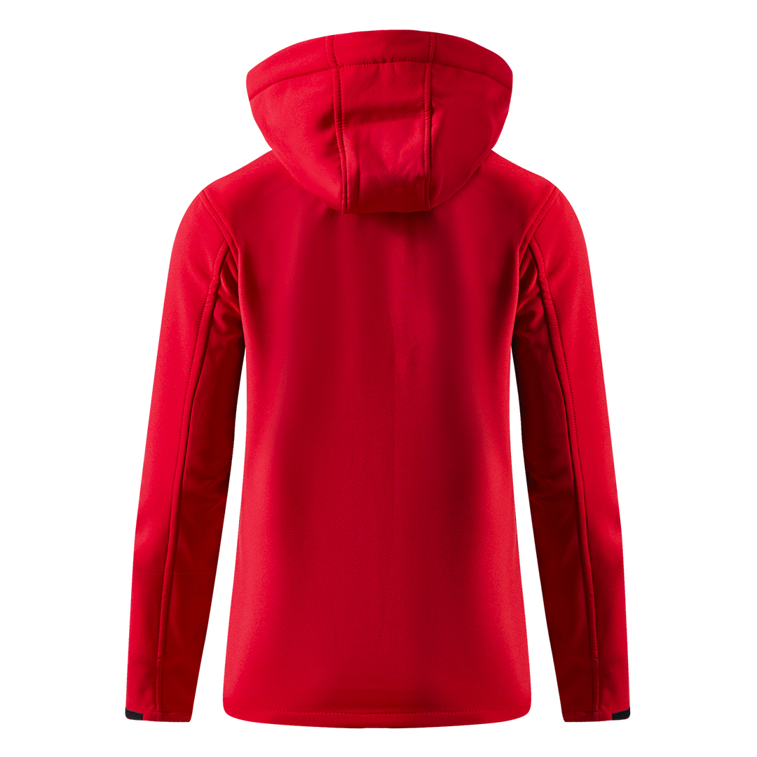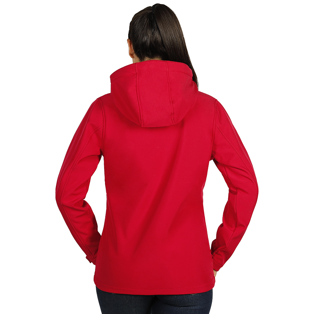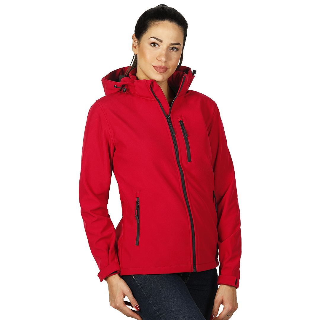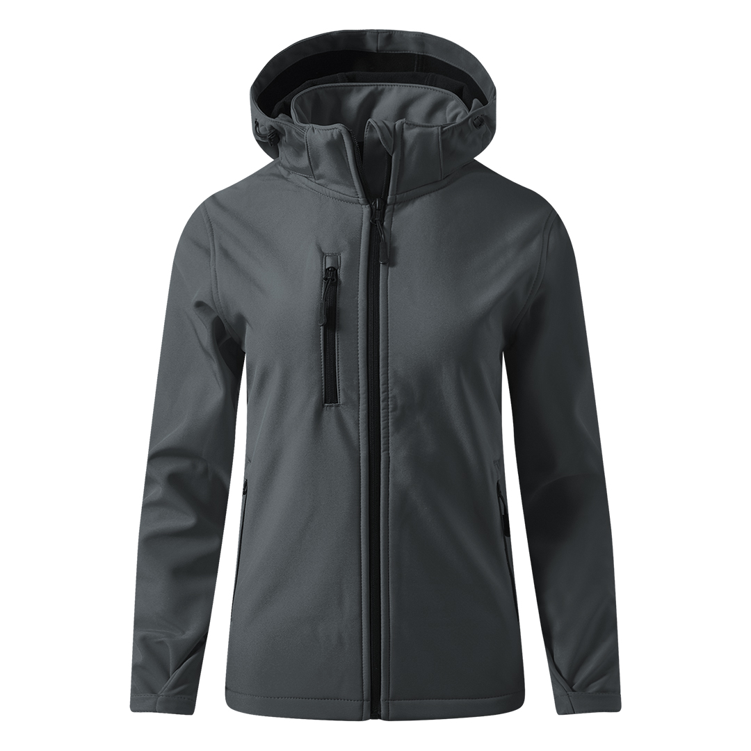 Ženska jakna, blago strukirana, visoka kragna, elastični učkuri sa steznim regulatorima u kapuljači, čičak traka za podešavanje širine na dnu rukava, dva prednja džepa sa rajsferšlusom i jedan džep na grudima
