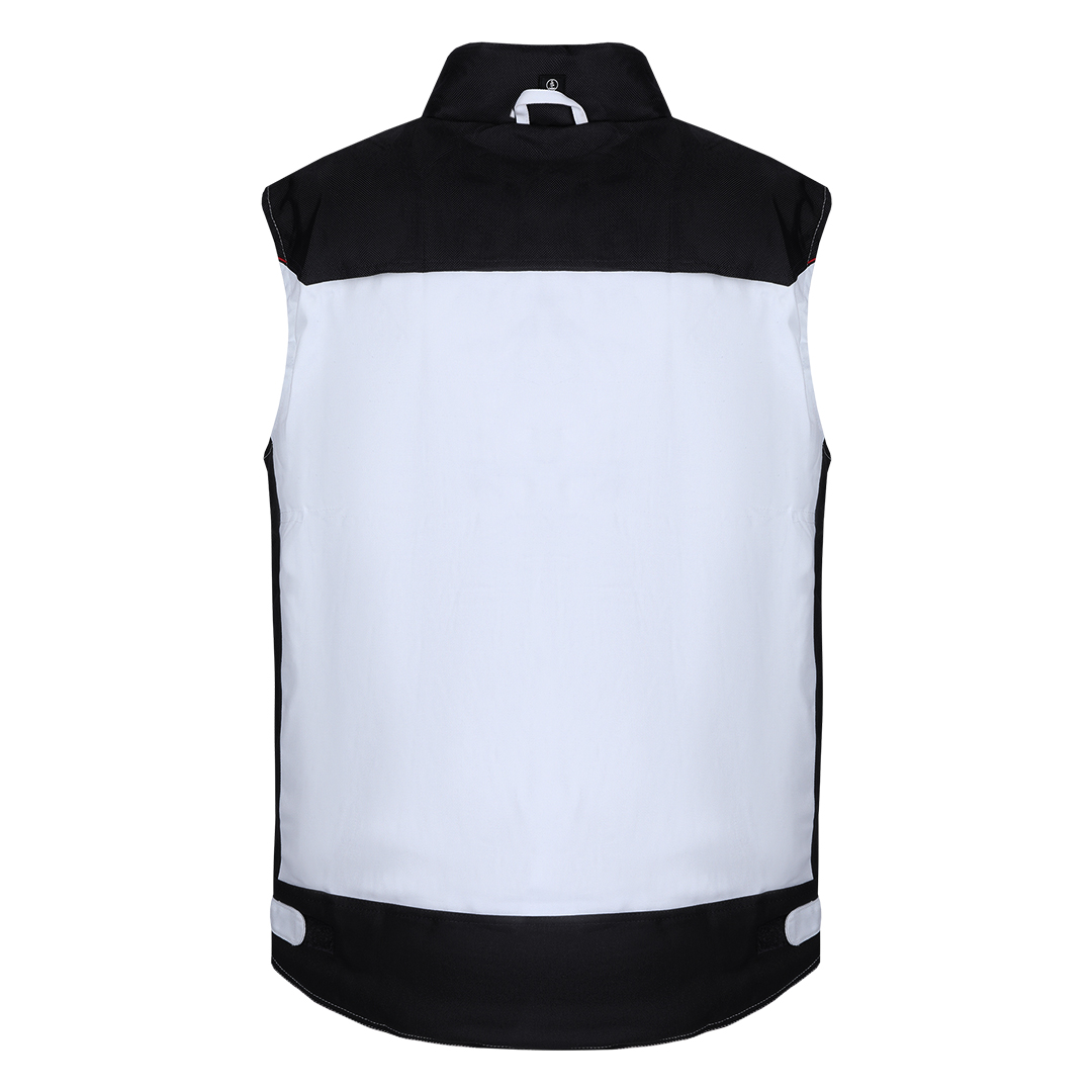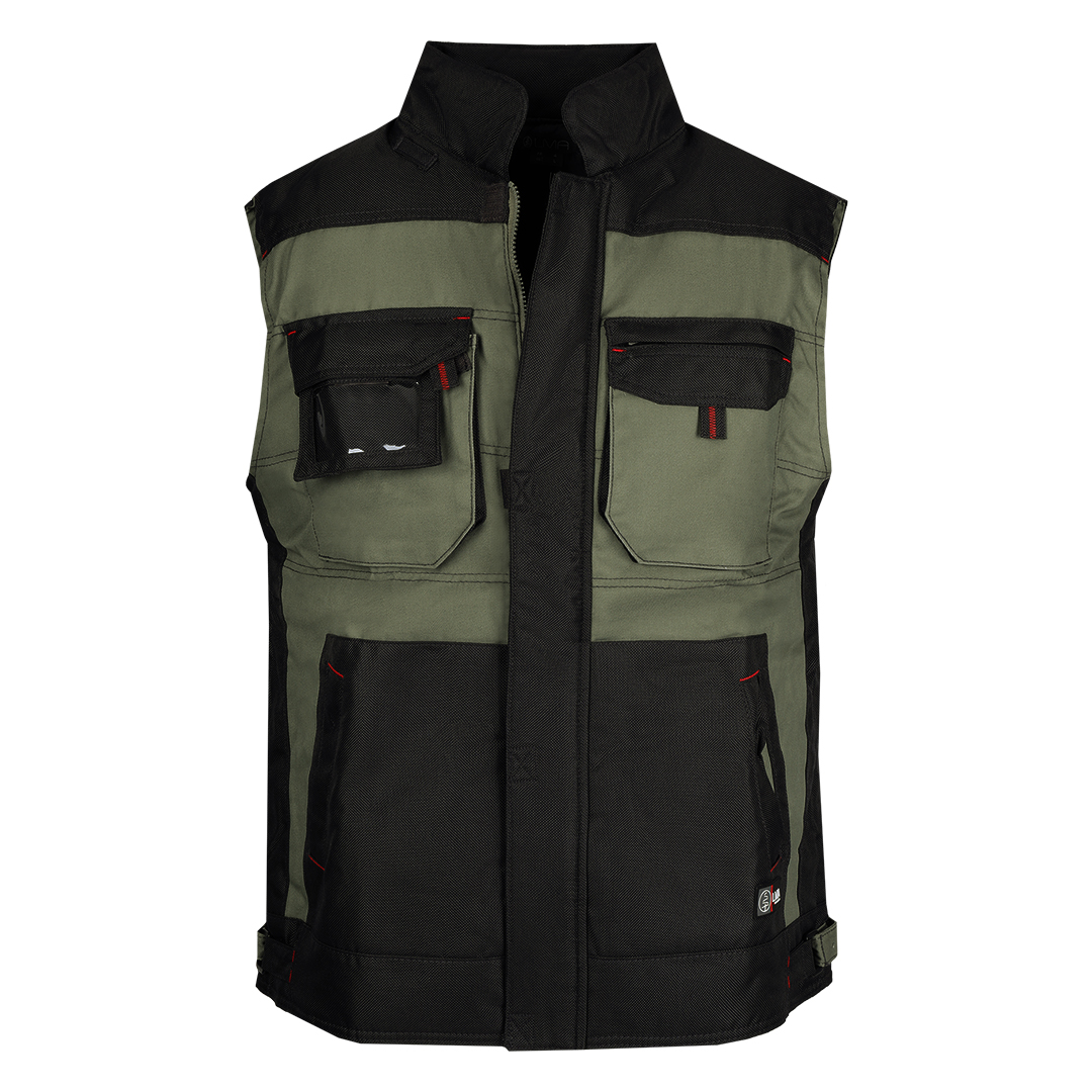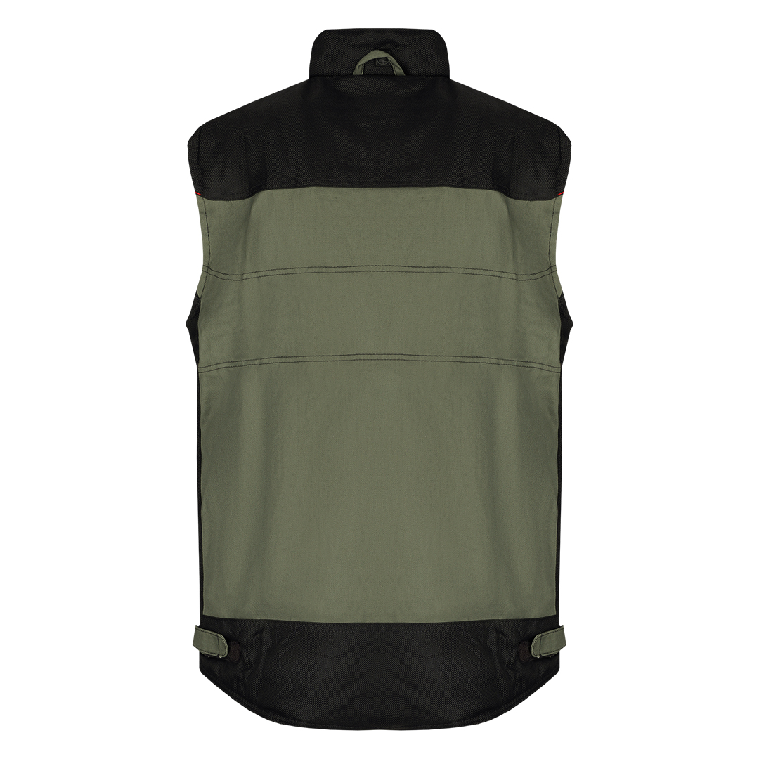 Radni prsluk, 300 g/m2, platno prepletaj, visoka kragna, ojačanja od 900D poliestera na mestima izloženim većem habanju, dva džepa na grudima uključujući odeljak za identifikacionu karticu, dva prednja džepa, jedan unutrašnji džep, čičak trake na dnu za podešavanje širine u struku, skriveni unutrašnji rajsferšlus na leđima za lakši pristup prilikom štampanja