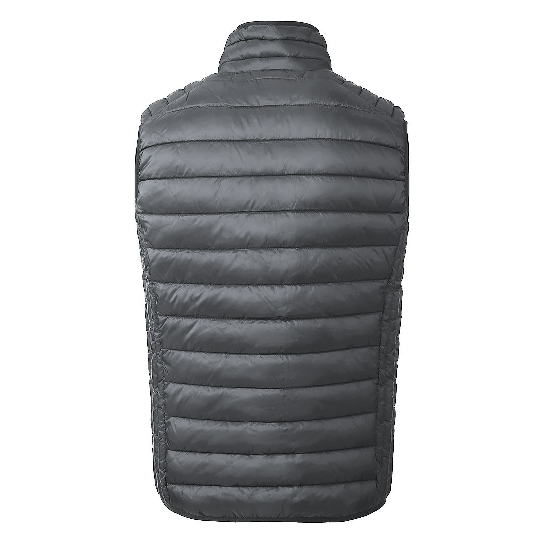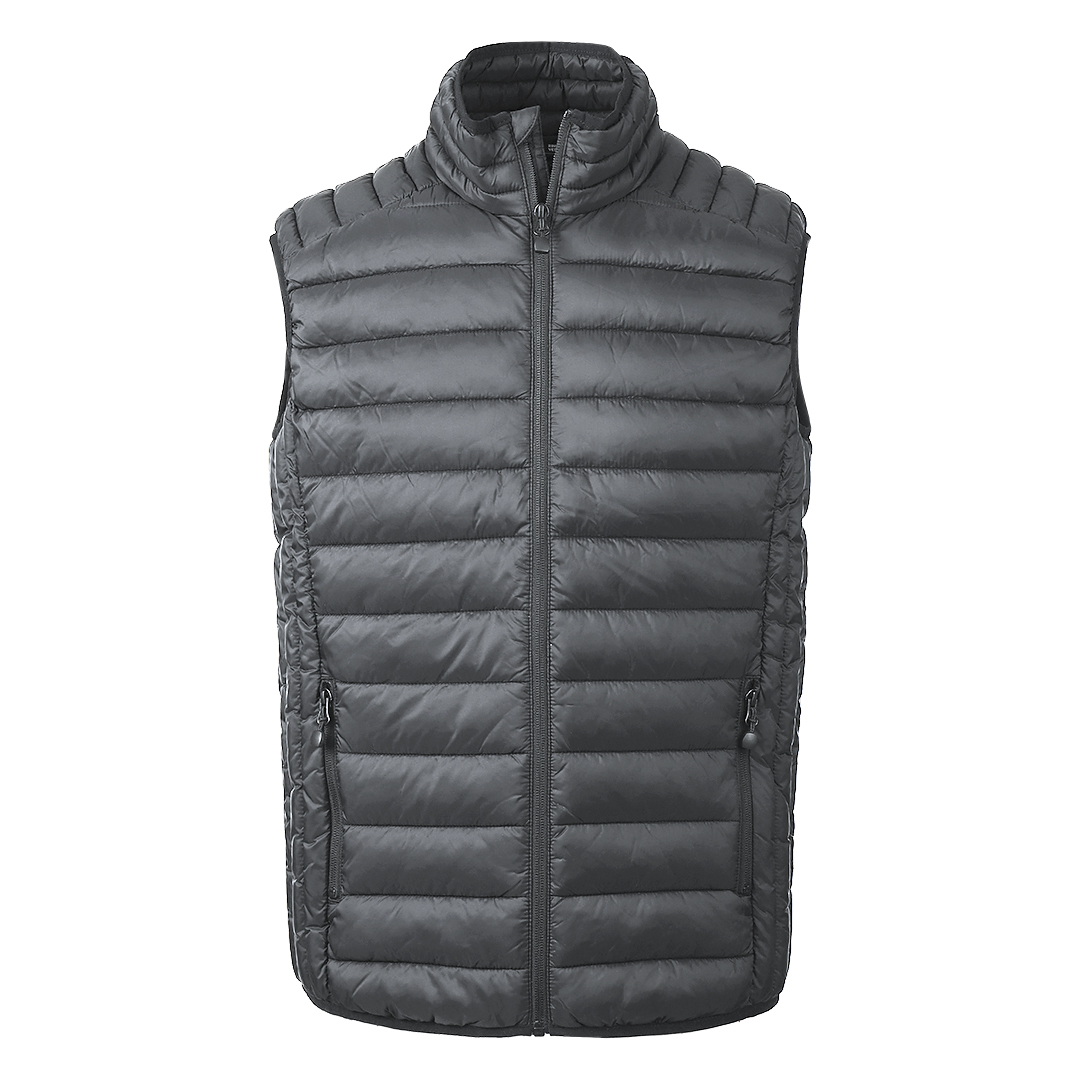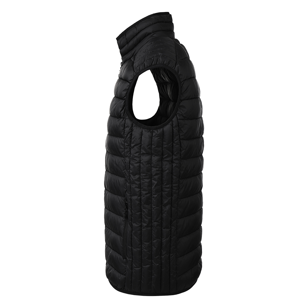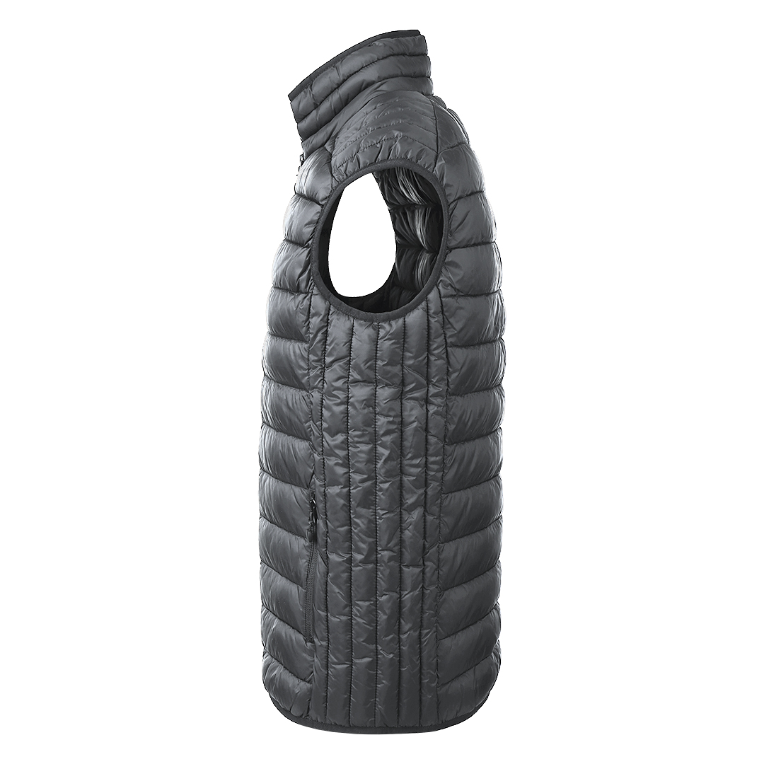 Prsluk sa laganim punjenjem, štepani, dva prednja džepa sa rajsferšlusom, elastični paspuli oko ramena i džepova, vrećica za pakovanje