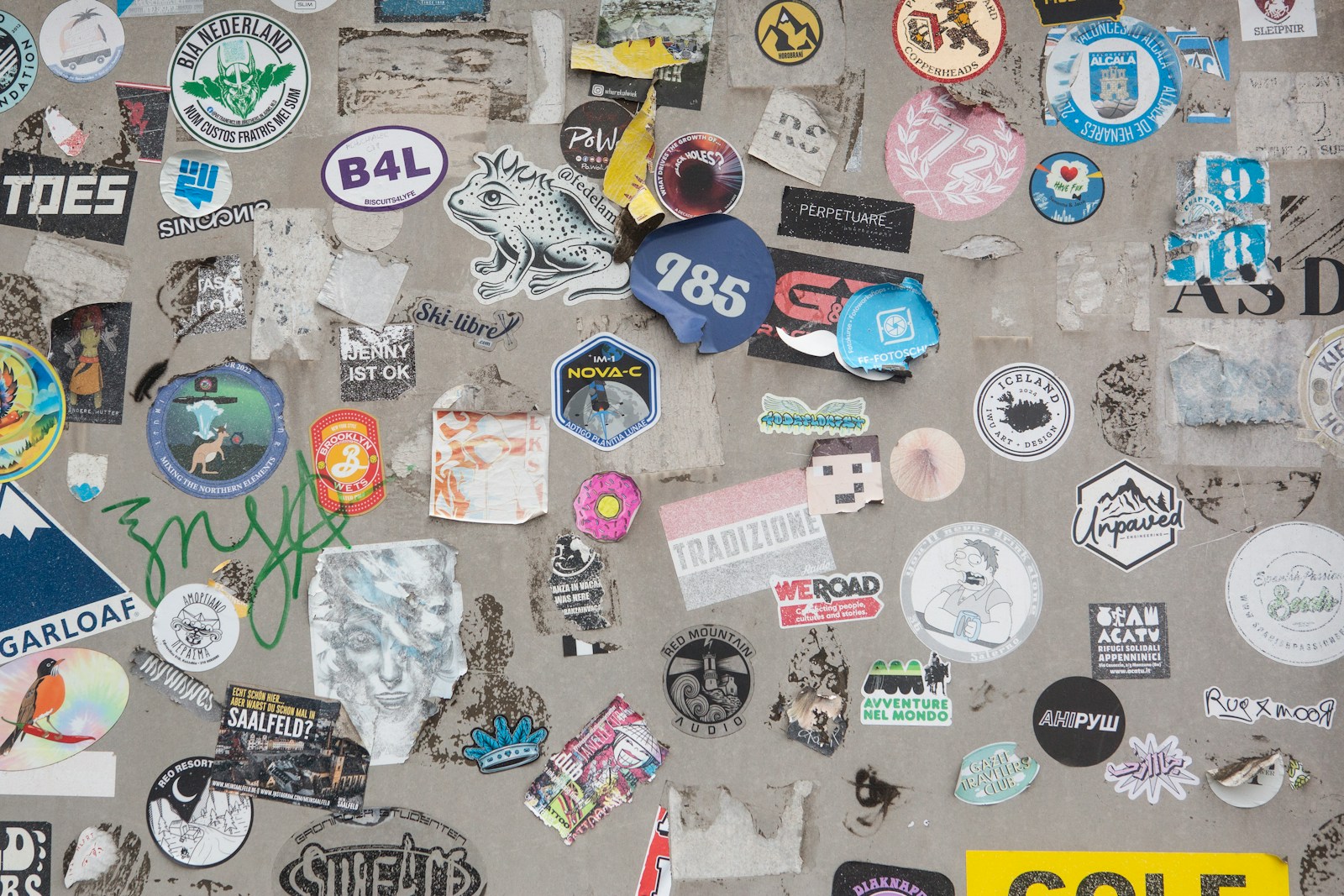 A wall covered in lots of different types of stickers