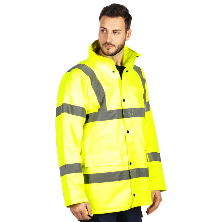 Sigurnosna zimska jakna Jakna, fluorescentna, visoka kragna, dve reflektivne trake napred, dve pozadi, dve na rukavima i jedna preko ramena,