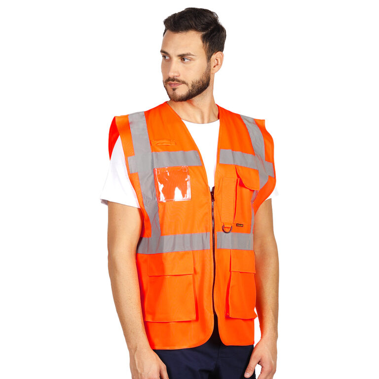 Radni prsluk Prsluk, fluorescentni, dve reflektivne trake napred, dve pozadi i jedna preko ramena, četiri prednja džepa, džep za mobilni