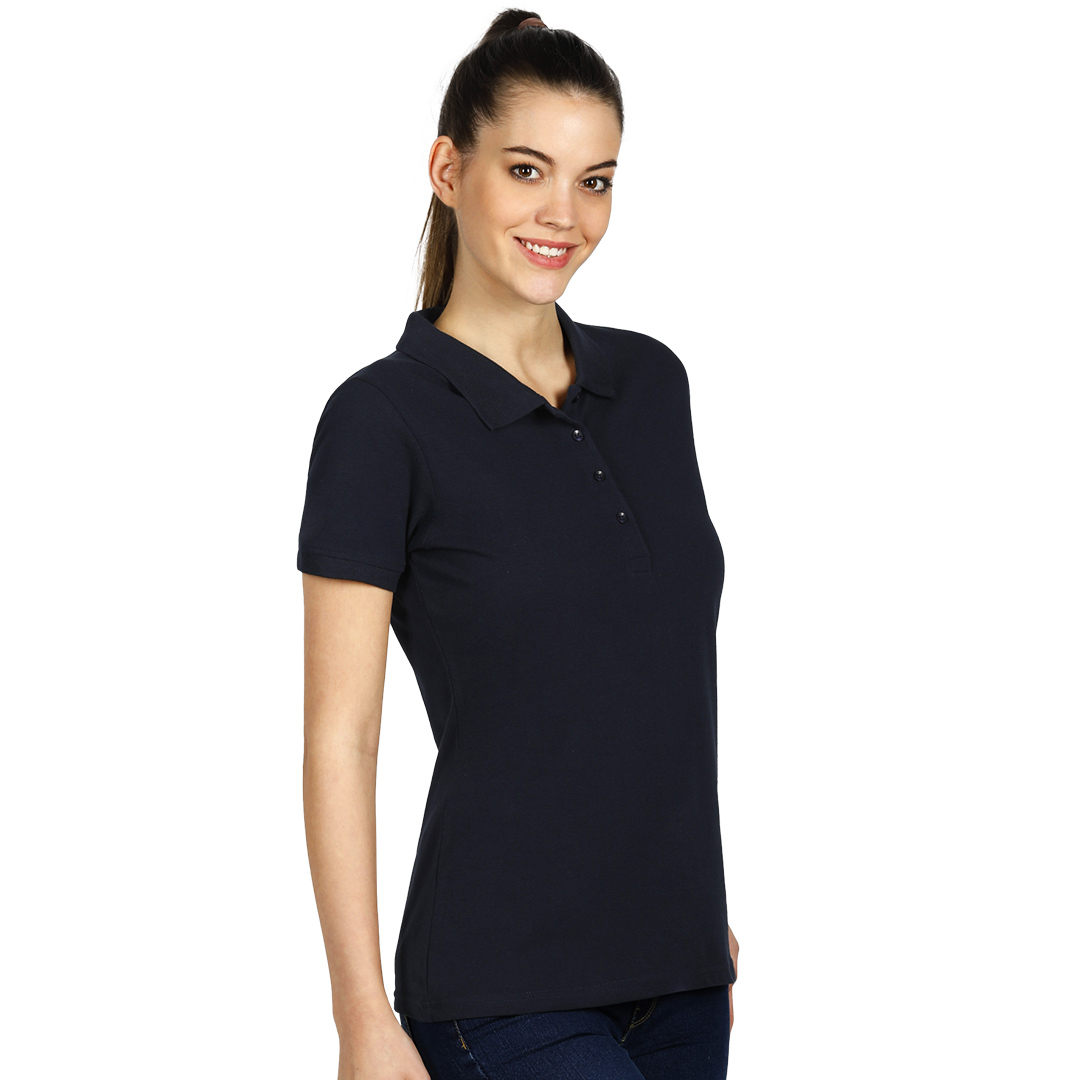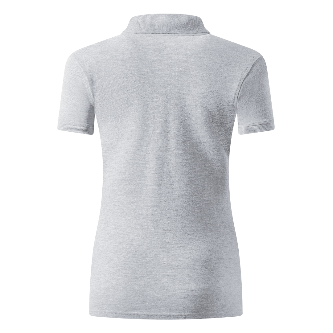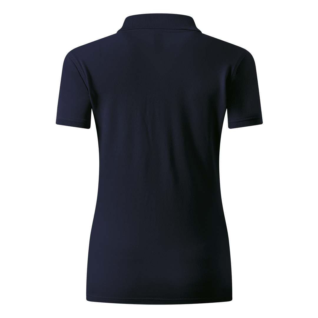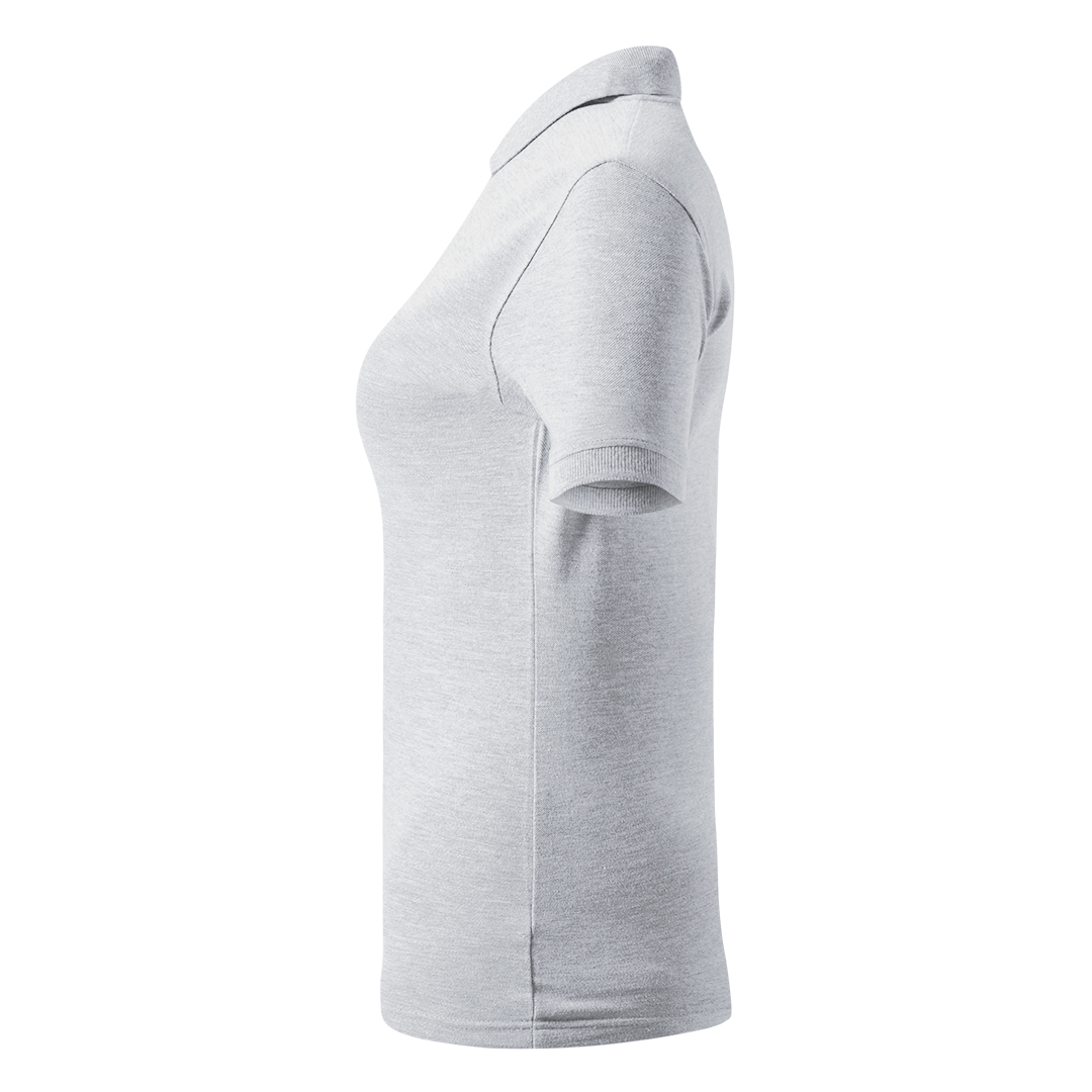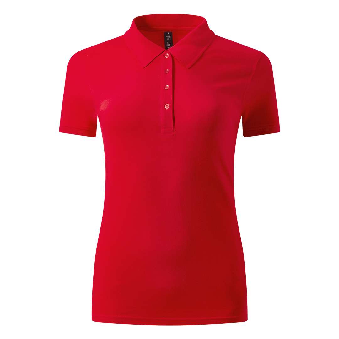 Ženska polo majica, 210 g/m2, blago strukirana, šivena sa strane, dupli štep na dnu, ranfle oko rukava, četiri dugmeta u boji majice, rezervno dugme, ojačana trakom duž vrata i dodatnim štepovima duž ramena, oko pazuha i ranfli